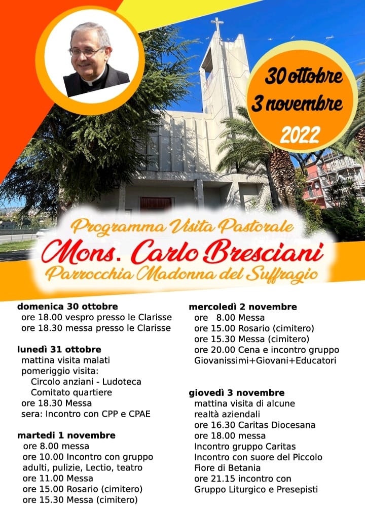 SAN BENEDETTO DEL TRONTO – Si apre oggi la visita pastorale del Vescovo Carlo Bresciani nella Parrocchia Madonna del Suffragio in San Benedetto del Tronto. La comunità, presieduta dal Parroco don Gianni Capriotti, riceverà il vescovo Bresciani da oggi, domenica 30 ottobre, a giovedì 3 novembre.