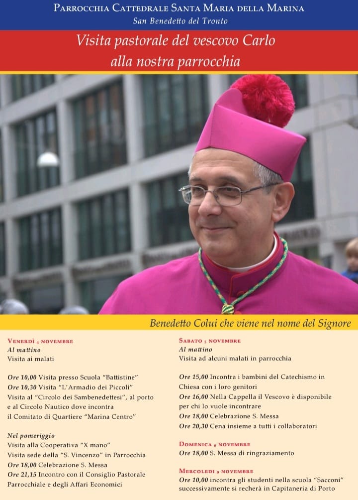 SAN BENEDETTO DEL TRONTO – Si aprirà domani, venerdì 4 novembre, la visita pastorale del Vescovo Carlo Bresciani nella Parrocchia Santa Maria della Marina in San Benedetto del Tronto. La comunità, guidata dal Parroco don Patrizio Spina, vicario generale della Diocesi, riceverà il vescovo Bresciani nei giorni 4, 5 e 6 novembre.