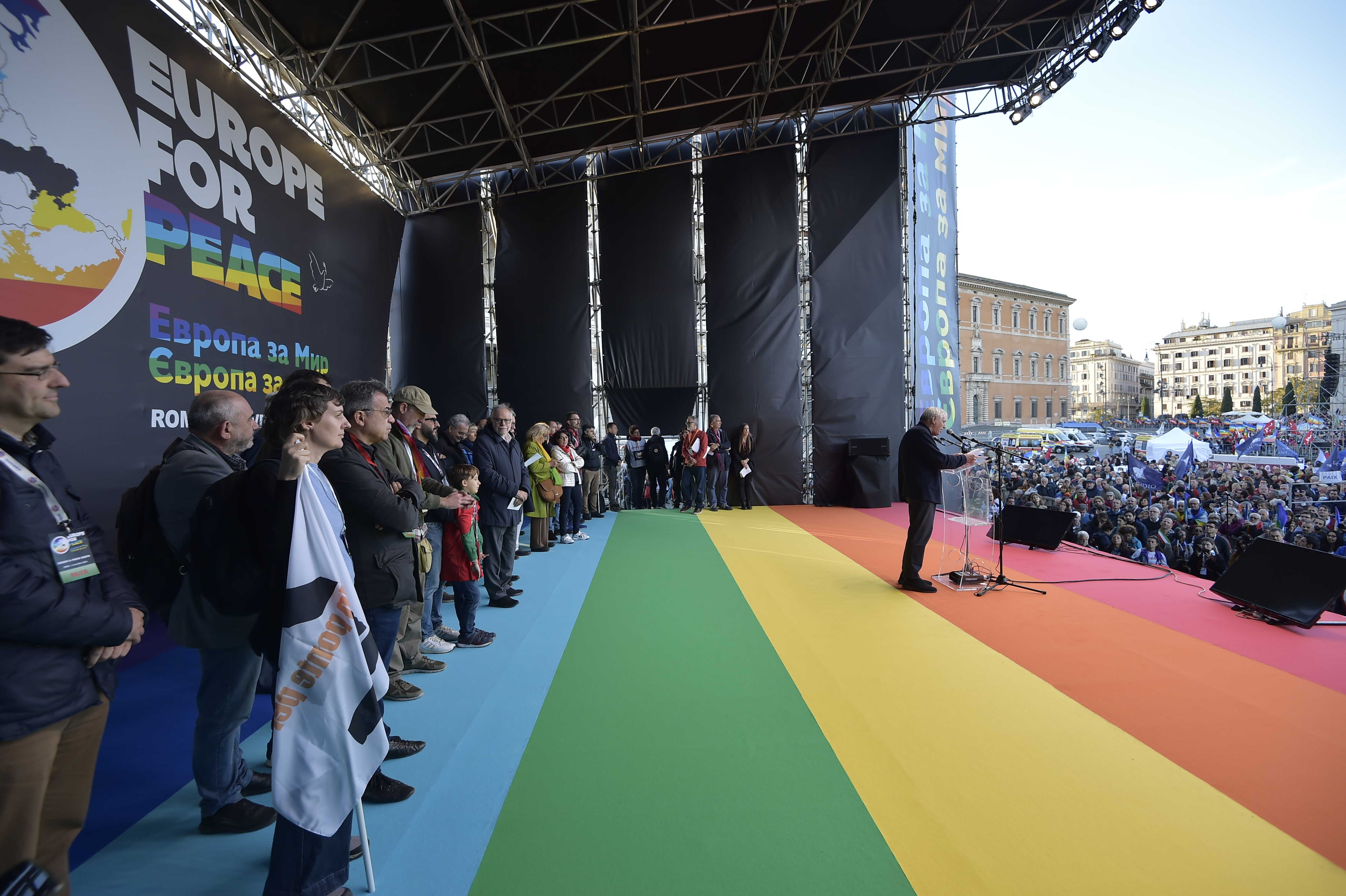è il coro che instancabile è stato ripetuto continuamente per le strade di Roma oggi pomeriggio da giovani, anziani e famiglie. E potrebbe terminare qui la cronaca della manifestazione per la pace convocata dalla Coalizione “Europe for Peace”, che ha radunato oggi nella capitale decine di migliaia di persone, rappresentanti di diverse realtà ma anche semplici cittadini che non sopportano quanto sta accadendo in Ucraina, come anche in Iran e in tutti i Paesi dove non viene rispettata la libertà di ogni essere umano. La musica, i cori e lo striscione emblema, alle ore 13,30, hanno avviato il corteo che da piazza della Repubblica si è mosso fino a piazza San Giovanni in Laterano, tra la gente cartelli con slogan inneggianti alla pace, bandiere colorate piccole e grandi, come quella portata da decine di mani diverse. Dal palco, posizionato proprio davanti alla basilica di San Giovanni in Laterano, si sono alternati gli interventi che hanno rilanciato il messaggio promosso dalla manifestazione, iniziando da Francesca Giuliani per Sbilanciamoci, Raffaella Bolini di Arci, Rossella Miccio di Emergency e Associazione Ong italiane, Gianfranco Pagliarulo per Anpi, Emiliano Manfredonia di Acli, Sergio Bassoli di Rete italiana pace disarmo, Flavio Lotti della Tavola della pace e Comitato promotore Marcia Perugia Assisi, Giuseppe De Marzo di Rete dei Numeri pari, Gianpiero Cofano di Stop the war now, Francesco Scoppola per l’Agesci, don Luigi Ciotti di Libera, Andrea Riccardi della Comunità di Sant’Egidio, Maurizio Landini della Cgil ed altri ancora come ad esempio Nicolas Marzolino, giovane ferito da un ordigno inesploso e consigliere dell’Associazione nazionale vittime civili di guerra, che ha messo in evidenza l’impatto devastante a lungo termine delle guerre e delle armi. Prima degli interventi però dai monitor sono stati rilanciati i video testimonianza di Katrin Cheshire, attivista del Movimento pacifista ucraino, e Alexander Belik, coordinatore del Movimento degli obiettori di coscienza russi, assieme alla lettura del messaggio di Setsuko Thurlow, sopravvissuta di Hiroshima.