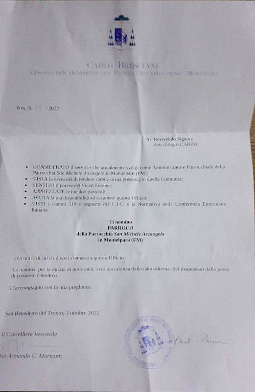 Tutto è iniziato domenica 13 quando, nella celebrazione della Santa Messa il Vescovo Carlo ha nominato Don Giorgio Carini, che già da un anno ricopriva qui la carica di Amministratore, parroco della parrocchia di San Michele Arcangelo! I fedeli presenti e la popolazione montelparese tutta hanno molto gioito di questa nomina: Don Giorgio si è saputo far apprezzare ed amare, in questo breve periodo qui già percorso, per la sua umanità, simpatia e attenzione verso i propri parrocchiani non trascurando mai quelle tradizioni, usi e costumi che qui ha incontrato!