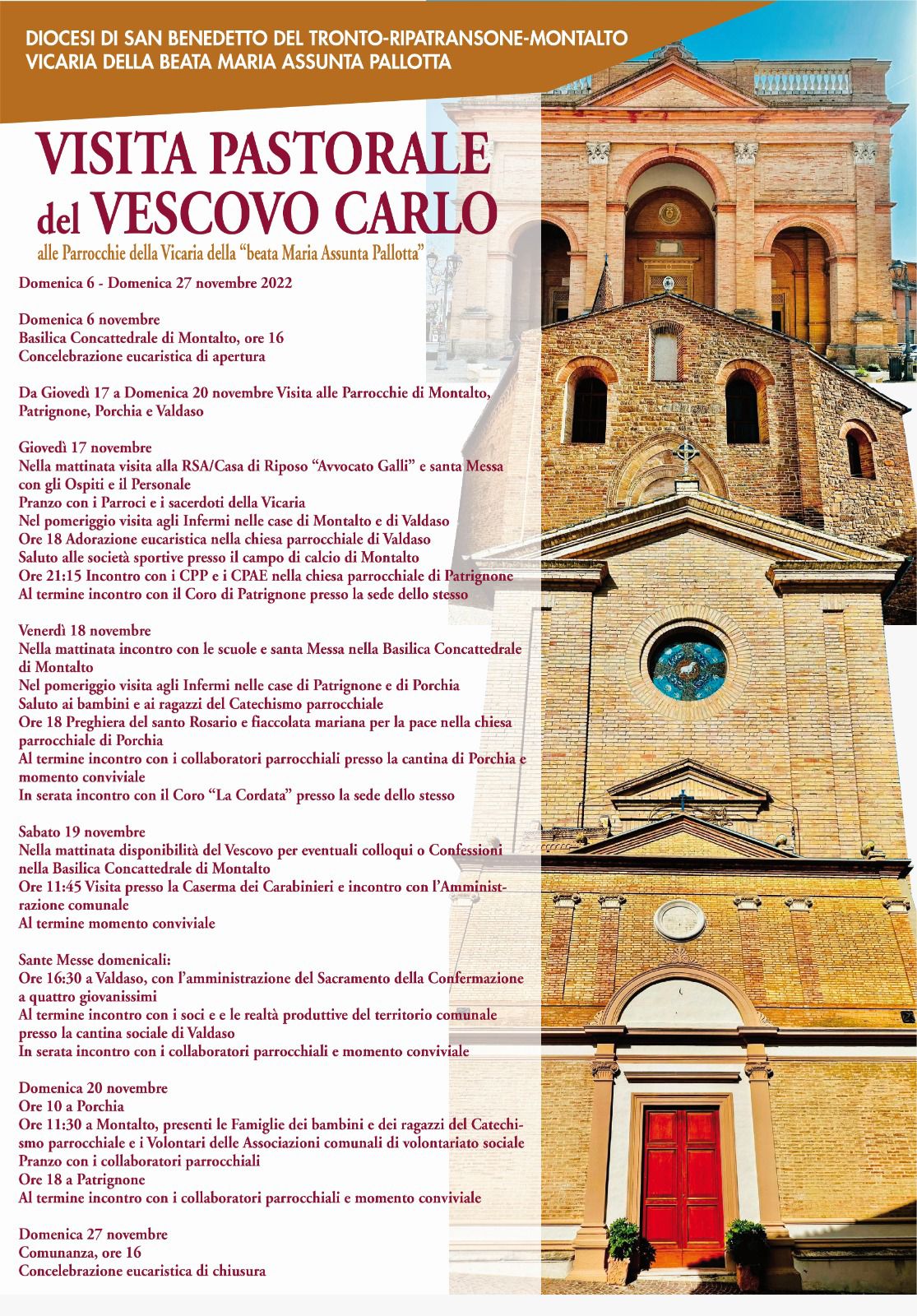 Queste le parole del parroco don Lorenzo alla vigilia della visita pastorale: “Dopo la bella celebrazione di apertura della visita pastorale nella vicaria della Beata Maria Assunta Pallotta, avvenuta nel pomeriggio di domenica 6 novembre nella nostra Basilica Concattedrale di Montalto, sono molto ansioso di vivere i giorni che verranno come un’occasione di incontro e confronto tra le realtà ecclesiali e civili della nostra Città e delle nostre Parrocchie con il nostro Vescovo Carlo, che non viene di certo per la prima volta in mezzo a noi, ma anzi conosce già diversi aspetti della vita del nostro territorio, anche se, sicuramente, questi giorni lo aiuteranno a dialogare in maniera più significativa con le diverse componenti delle nostre Comunità parrocchiali e le istituzioni del nostro Comune. L’opportunità che la visita pastorale offre in effetti, ovvero quella di raccogliere in poco tempo a colloquio con il nostro Pastore le diverse situazioni concrete di vita ecclesiale ed extraecclesiale, è senza dubbio un valido aiuto per la ripresa e il potenziamento della pastorale delle nostre antiche e sempre preziose Comunità cristiane, soprattutto dopo questo lungo e sofferto periodo, pesantemente limitato dalla pandemia e dalle sue conseguenze, in quello stile sinodale che papa Francesco e la Chiesa tutta desiderano ormai come metodo di annuncio, di celebrazione e di testimonianza nella carità per abitare da discepoli di Cristo il nostro tempo, portando in esso la gioia del Vangelo.”