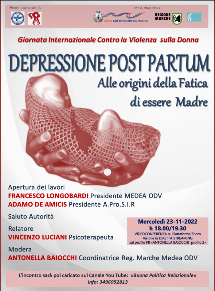 SAN BENEDETTO DEL TRONTO – L’Associazione A.Pro.S.I.R., Mercoledì 23 novembre 2022 alle ore 18:00/19:30, organizza la videoconferenza “Depressione post partum: alle origini della fatica di essere madre”. Relatore d’eccezione il dott. Vincenzo Luciani, psicoterapeuta, già direttore del Consultorio Familiare Area Vasta 5, realizza in collaborazione tra associazioni A.Prosir e Medea ODV, presidente Francesco Longobardi, che sarà anch’esso presente per i saluti. “Nell’ottica della Tutela inclusiva di tutte le vittime, senza distinzione di sesso che portiamo avanti”, commenta Adamo De Amicis presidente A.Pro.S.I.R. “Dopo l’iniziativa “Figli di genitori minori” (dedicata alla commemorazione delle Giornate internazionali del 19 e 20 novembre dedicate all’uomo e ai minori) proponiamo una seconda iniziativa dedicata solo alle donne, per onorare la Giornata mondiale contro la violenza sulle donne: ringraziamo di cuore il dott. Luciani Vincenzo, una ineccepibile risorsa del nostro territorio. Ci tengo a ricordare che il 26 novembre ci sarà un convegno dal vivo all’Auditorium Tebaldini del Comune di San Benedetto del Tronto che si intitolerà “Tutela per tutte le vittime: donne, minori e uomini. Affinché tutte le vittime siano di serie A”, con crediti per avvocati e Attestato di partecipazione per chiunque interverrà”. La dott.ssa Antonella Baiocchi, moderatore dell’evento nonché Direttore scientifico delle iniziative, ha commentato: “Nei mesi immediatamente successivi alla nascita del bambino, può accadere che una madre sperimenti sentimenti di depressione che vengono però spesso sottovalutati essendo considerati normali reazioni allo stress associato al dover prendersi cura di un neonato. Sono turbamenti che la maggior parte delle madri è in grado di superare, ma a volte il problema non si risolve e trascende: il dott. Luciani ci illustrerà come riconoscere il problema, i campanelli d’allarme e come fronteggiarlo”.
