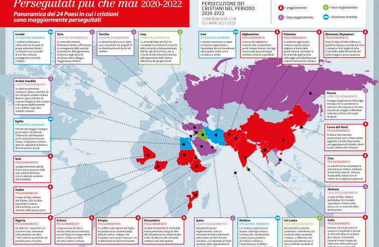 “Perseguitati più che mai. Rapporto sui cristiani oppressi per la loro fede 2020 – 2022”: è il titolo della ottava edizione del Rapporto della Fondazione pontificia Aiuto alla Chiesa che Soffre (Acs), diffusa oggi, e che offre un quadro della sofferenza dei cristiani oppressi per motivi di fede. Lo studio presenta “informazioni della stessa Acs e di fonti locali, testimonianze di prima mano, raccolte di eventi di persecuzione, studi di casi e analisi nazionali” da porre all’attenzione della pubblica opinione, dei mass media e dei responsabili istituzionali. Il report esamina 24 Paesi in cui le violazioni della libertà religiosa destano particolare preoccupazione: Afghanistan, Arabia Saudita, Cina, Corea del Nord, Egitto, Eritrea, Etiopia, India, Iran, Iraq, Israele e i Territori Palestinesi, Maldive, Mali, Mozambico, Myanmar, Nigeria, Pakistan, Qatar, Russia, Sri Lanka, Sudan, Siria, Turchia e Vietnam. Il periodo di riferimento va dall’ottobre 2020 al settembre 2022.