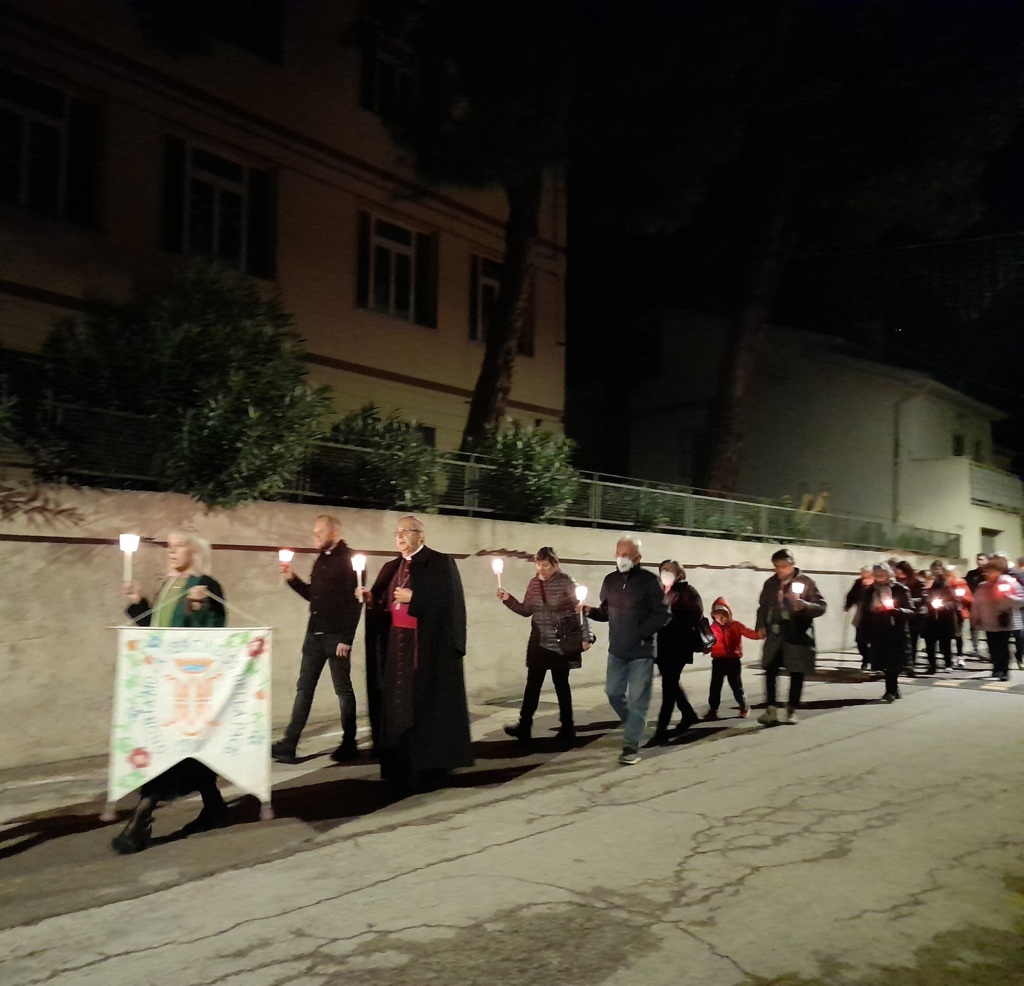 Anna Maria Angelici, sacrista e custode della chiesa parrocchiale, dichiara: “Il vescovo Carlo ha iniziato la visita nella nostra parrocchia venerdì 18 novembre, andando prima ad incontrare alcuni malati della nostra comunità e poi partecipando ad un momento di raccoglimento e preghiera con i fedeli della comunità nella nostra chiesa parrocchiale. Per l’occasione abbiamo portato nella chiesa di Santa Lucia la statua di Maria che si trova abitualmente nella chiesetta Madonna della Pace ai piedi del fiume Menocchia. Abbiamo infatti detto il Rosario per invocare la pace nel mondo, ma soprattutto nei nostri cuori, perché – come ci ha ricordato il vescovo Bresciani – tutto parte dal nostro cuore, dal fatto di stare in pace con noi stessi, con Dio, con i nostri familiari e in pace nelle nostre comunità. Il momento più emozionante della serata è stato quando siamo usciti dalle mura dell’edificio sacro per percorrere le strade del paese cantando le litanie lauretane alla Vergine e portando luce lungo le vie con le nostre piccole, ma luminosissime fiaccole. Nonostante il clima rigido e l’orario non favorevole, eravamo comunque un bel gruppetto di fedeli. Mi sono molto emozionata nel sentire il vescovo Carlo che, con la sua voce potente, partecipava alle invocazioni alla Madonna: è stato un alto momento di preghiera che, oltre a farci sentire più uniti ed in armonia tra noi, ci ha anche incoraggiato ad affrontare le difficoltà quotidiane con maggiore vigore e speranza.”