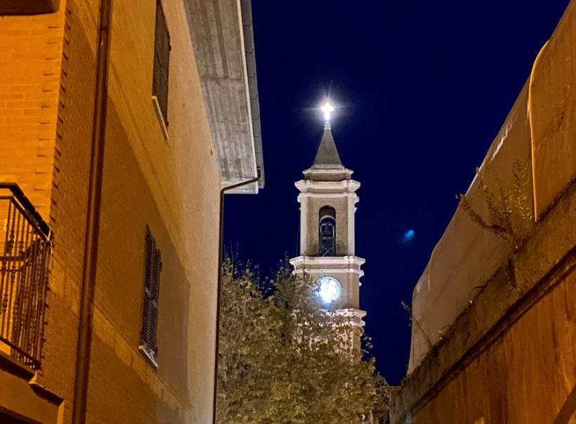 In foto: una suggestiva immagine invernale notturna del campanile di San Pio V a Grottammare.