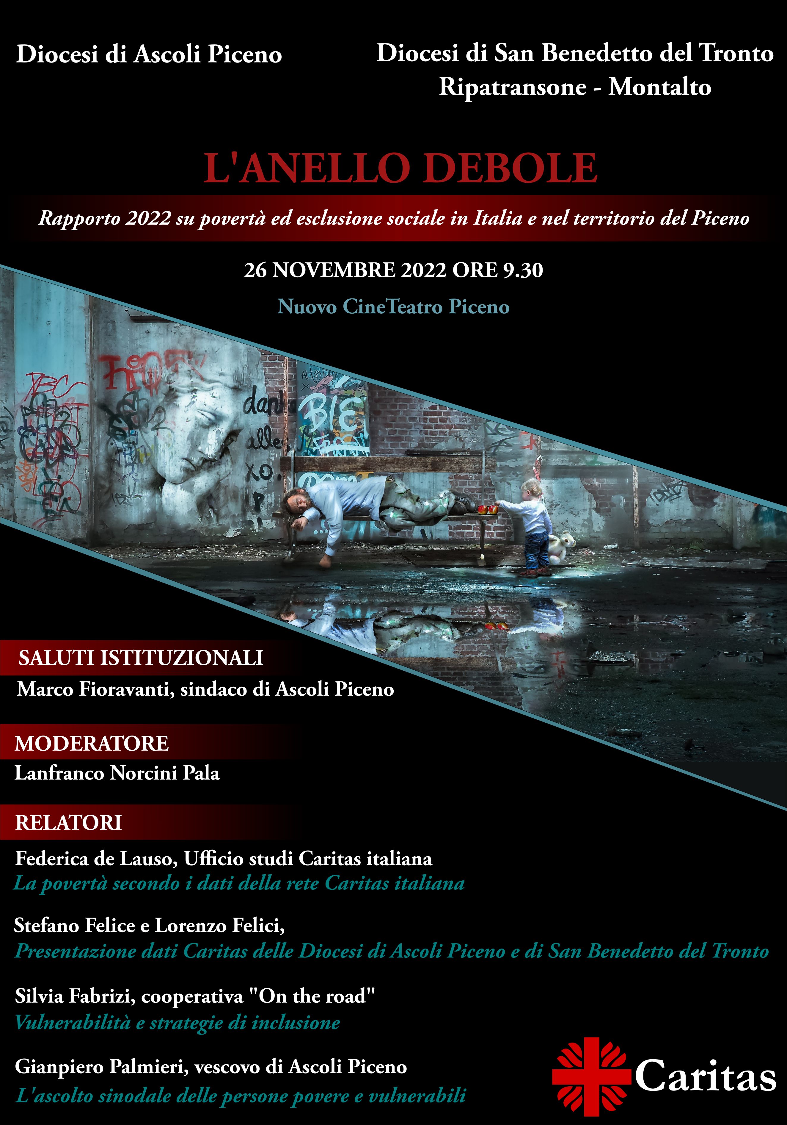 DIOCESI – Non una ma tante povertà: sono quelle presenti anche nel territorio Piceno e che rappresentano l’anello debole di una società già di per sé in profonda crisi. Sarà proprio la povertà il tema al centro dell’incontro promosso dalla Diocesi di Ascoli Piceno e da quella di San Benedetto del Tronto – Ripatransone – Montalto in programma per sabato 26 novembre alle ore 9:30 presso il Cineteatro Piceno del capoluogo.