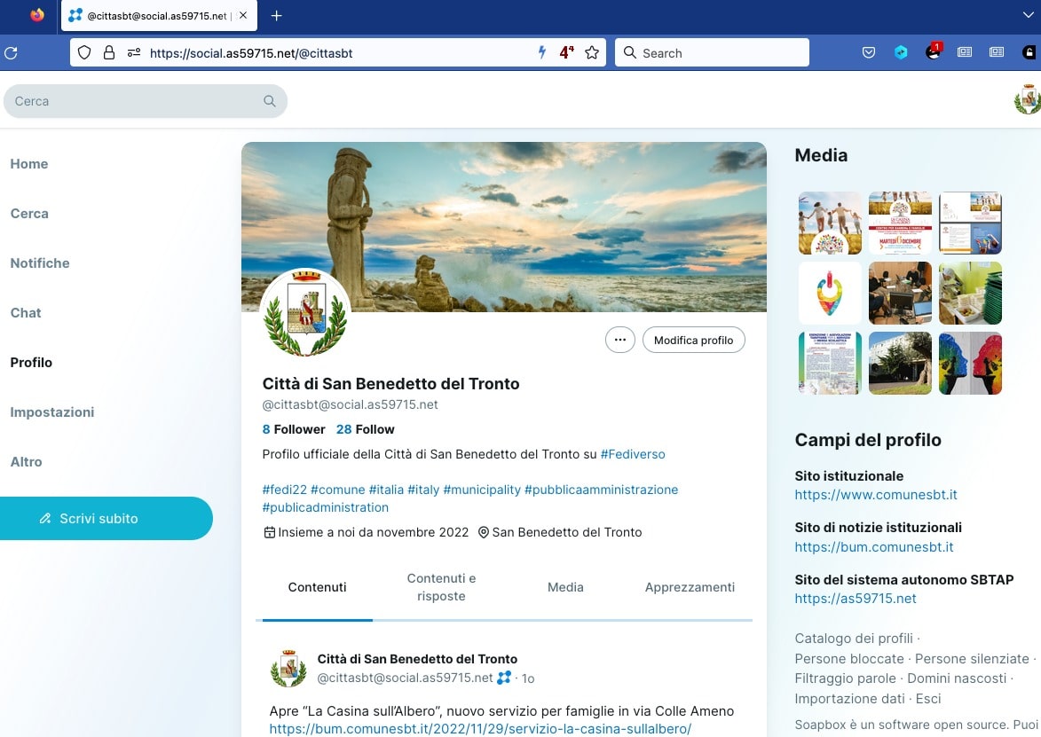 Il Comune di San Benedetto del Tronto, grazie alla presenza nel sistema autonomo SBTAP, ha creato un server che fa parte del Fediverse e ha dunque un proprio account attivo raggiungibile con il nome cittasbt@social.as59715.net