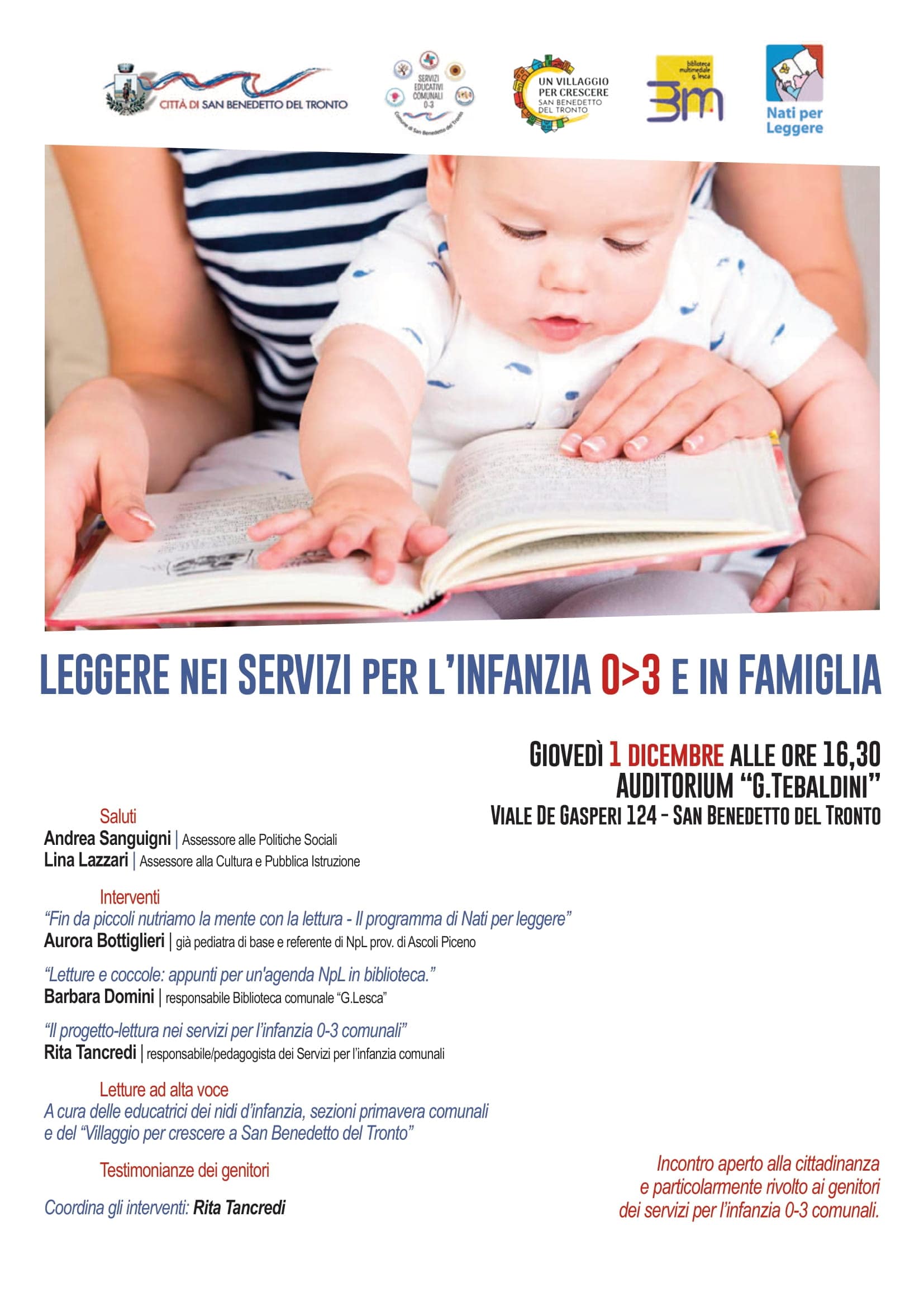 Dopo i saluti istituzionali degli assessori alla Cultura e alle Politiche Sociali, Lina Lazzari e Andrea Sanguigni, il programma del convegno prevede gli interventi della dottoressa Aurora Bottiglieri, pediatra e referente per la provincia di Ascoli Piceno del progetto “Nati per Leggere”, della dottoressa Barbara Domini, responsabile della Biblioteca comunale “Giuseppe Lesca”, e della dottoressa Rita Tancredi, pedagogista e responsabile del Servizio comunale per l’infanzia.