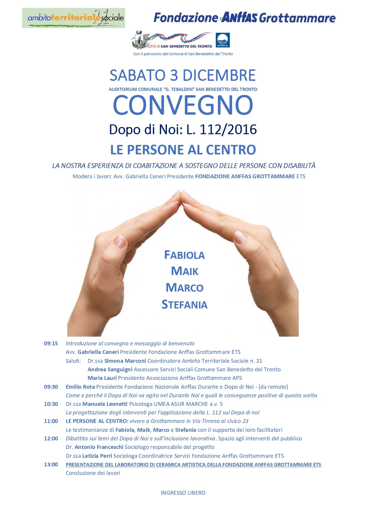 SAN BENEDETTO DEL TRONTO – In occasione della Giornata Mondiale sui Diritti delle Persone con Disabilità, si svolgerà domani, sabato 3 dicembre, dalle ore 9:15 alle ore 13:15, presso l’Auditorium Comunale Tebaldini di San Benedetto del Tronto, il convegno dal titolo “Dopo di noi – Le persone al centro”, organizzato dalla Fondazione Anffas Grottammare Ets con il patrocinio del Comune di San Benedetto del Tronto. L’incontro, che registrerà la presenza di ospiti illustri, sarà un’occasione importante per parlare del futuro dei ragazzi disabili, della loro vita da adulti e di come i loro genitori possano destinare dei beni a loro vantaggio, creando un patrimonio segregato, allo scopo di finanziare il progetto di vita deciso dai genitori per il proprio figlio. Il momento centrale del convegno sarà caratterizzato dalla testimonianza di quattro ragazzi disabili che parleranno della loro esperienza di coabitazione.