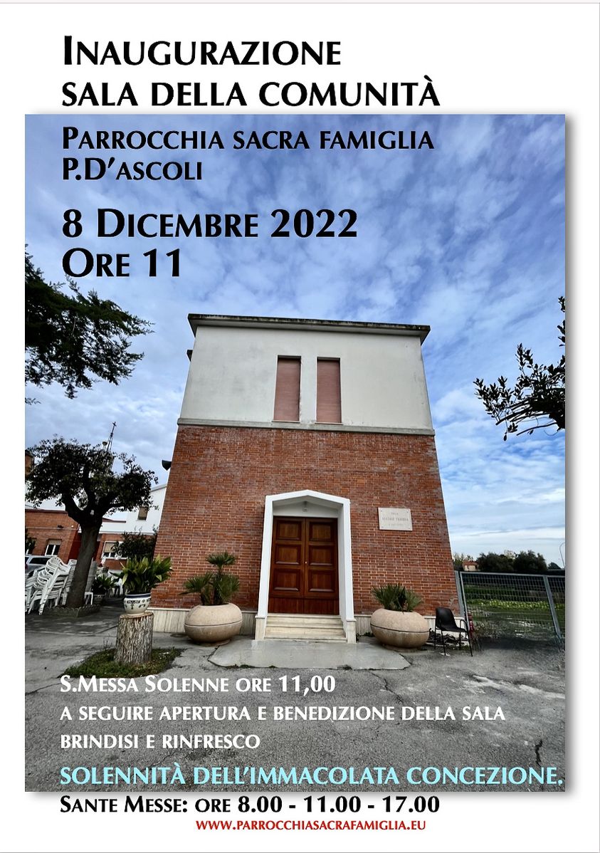 SAN BENEDETTO DEL TRONTO – Il giorno della solennità dell’Immacolata sarà festa grande per la parrocchia Sacra Famiglia di Ragnola: occasione per celebrare i 31 anni di sacerdozio del parroco don Francesco Ciabattoni e per restituire alla comunità la Sala intitolata a Madre Teresa di Calcutta, dopo mesi di intensi lavori.