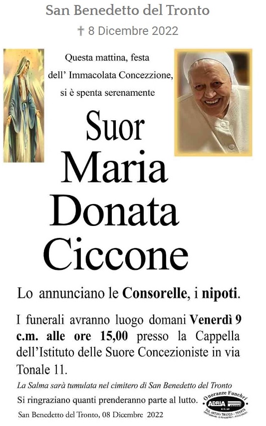 Veniva da Cermignano, paese abruzzese dal quale, in passato, c’era stato un esodo verso l’Istituto voluto da Mons.Marcucci per l’educazione , principalmente, delle ragazze e per l’accoglienza. Scherzosamente, quando la incontravo Le dicevo che era la suora più conosciuta di S.Benedetto per il dinamismo e per la sua capacità di affrontare i problemi senza timore tanto da essere un riferimento per tutto l’Istituto delle Concezioniste.