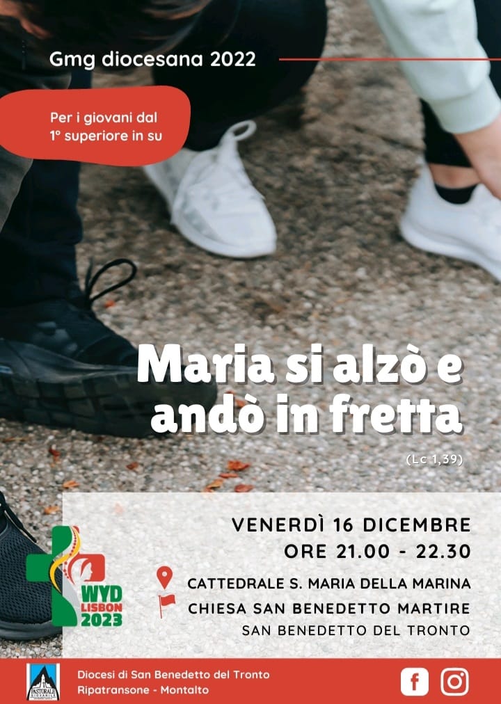 DIOCESI – Si terrà in pieno Avvento, venerdì 16 dicembre, dalle ore 21:00 alle ore 22:30, presso la Cattedrale Santa Maria della Marina di San Benedetto del Tronto, la GMG Diocesana 2022. L’incontro, dal titolo “Maria si alzò e andò in fretta”, che riprende il tema della prossima GMG e che è tratto dal Vangelo di Luca (Lc 1,39), è rivolto ai Giovanissimi ed ai Giovani della nostra comunità diocesana, quindi a tutti i ragazzi dal 1° Superiore in su, che avranno l’occasione per rivedersi e ritrovarsi nel medesimo cammino di comunione ed iniziare a pensare alla Giornata Mondiale della Gioventù di Lisbona che si terrà durante l’estate 2023.