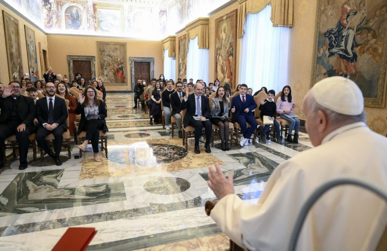 “A Dio non piace quando stiamo a impigrirci sul divano; lui ci vuole in movimento, in cammino, pronti e ben disposti a metterci in gioco. Andate! Ma verso dove, verso chi? Verso gli altri, verso – dice Gesù nel Vangelo – tutti i popoli, senza escludere nessuno”. E’ l’invito del Papa ai ragazzi dell’Acr, ricevuti oggi in udienza. “Il Signore non vuole che trascorriamo le giornate restando chiusi in noi stessi”, scrive Francesco nel testo consegnato: “E questo è un grande rischio per un ragazzo e una ragazza oggi: passare le giornate tenendo davanti agli occhi lo schermo di un telefonino. No, i nostri occhi sono fatti per guardare quelli degli altri. “Per testimoniare l’amore di Gesù, bisogna scendere in campo non individualmente, ma insieme, come gruppo”, spiega Francesco: “Bisogna, in altre parole, fare squadra, per scoprirci fratelli e sorelle in un mondo che tende a isolarci, a dividerci, a metterci l’uno contro l’altro; che ti dice: ‘pensa a te stesso e non preoccuparti degli altri’. Invece, il segreto è proprio prendersi cura degli altri. E così ci si prende cura anche di sé stessi”. “Si parte da qui, dal vedere in ogni persona non un avversario, ma un compagno di squadra, un figlio di Dio: ecco lo spirito con cui vincere l’indifferenza”, l’indicazione del Papa, insieme a quella a seguire. “non i ricchi e i potenti, non chi sta già sulle copertine delle riviste patinate o in televisione, ma i più piccoli, i poveri, i dimenticati, gli scartati, quelli di cui nessuno si cura. Pensare a loro e a quello che serve e a loro, anziché a quello che manca a noi, è il segreto per rendere più bello, giusto e pacifico il nostro mondo, che di pace ha tanto bisogno. E io per questo mi affido a voi, al vostro sguardo d’insieme sul futuro, alla vostra forza di andare e soprattutto alla vostra preghiera per la pace, che è potente e può fare grandi cose! Non dobbiamo avere paura di scendere in campo, di metterci in gioco”.