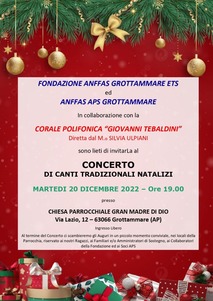 GROTTAMMARE – La Fondazione Anffas Grottammare ETS e Anffas APS Grottammare, in collaborazione con la Corale Polifonica “Giovanni Tebaldini” diretta dal M° Silvia Ulpiani, sono lieti di invitare al Concerto di canti tradizionali natalizi che si terranno martedì 20 dicembre alle ore 19:00, presso la parrocchia Gran Madre di Dio di Grottammare.