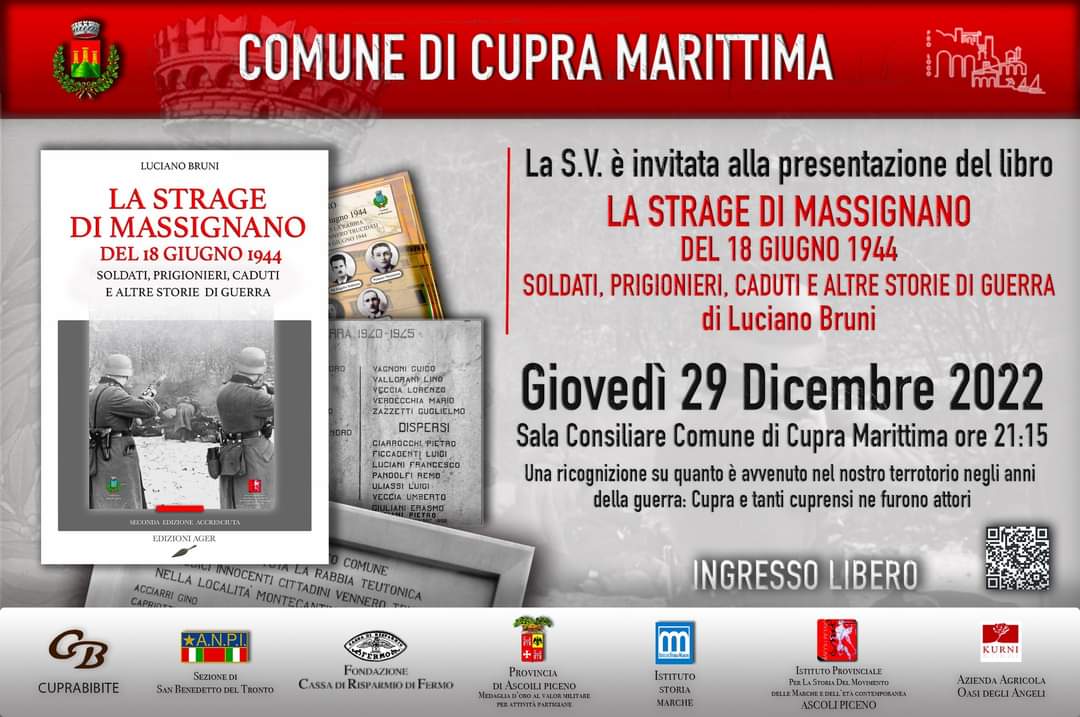 CUPRA MARITTIMA – Sarà presentato a Cupra Marittima, presso la Sala Consiliare, giovedì 29 dicembre alle ore 21,15 il volume La strage di Massignano del 18 giugno 1944. Caduti, prigionieri, reduci e altre storia di guerra, una dettagliata indagine sullo storico efferato fatto di sangue.