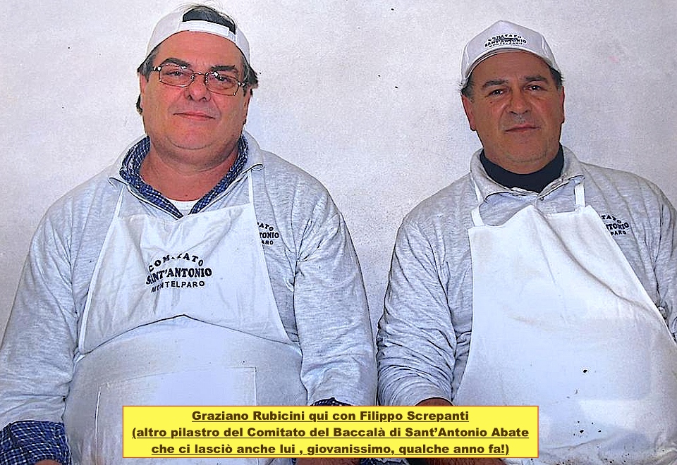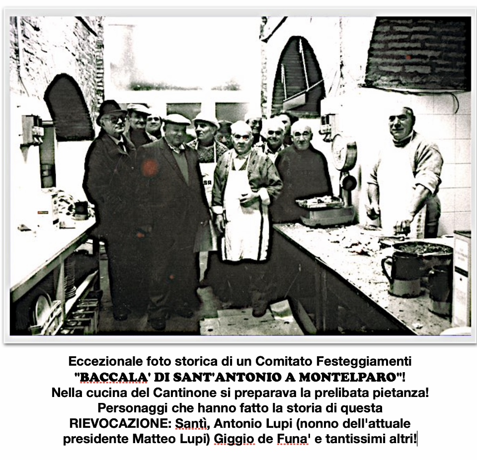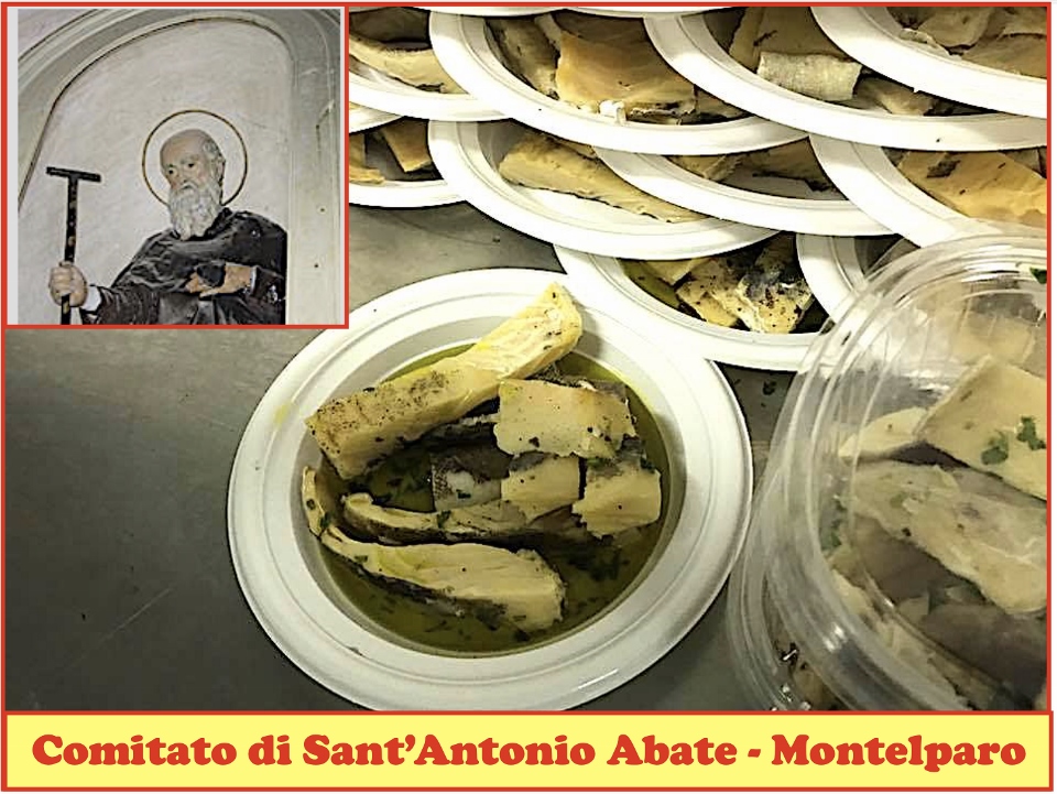 Negli anni immediatamente successivi, all’interno dei festeggiamenti del santo patrono degli animali Sant’Antonio Abate, i Frati di Sant’Agostino istituirono una vera e propria degustazione del baccalà. Essa consisteva nell’ammettere i montelparesi alla mensa dei Frati per “sdiunarsi” dopo essersi comunicati ed aver versato al Convento delle offerte. Da allora l’usanza, con il rituale rinnovato ogni anno e fortemente sentito, è rimasta. Ha resistito negli anni e, anzi, nei secoli! Fu ripetuta, anno dopo anno, dai frati Agostiniani fino a quando ci fu la loro presenza all’interno del convento. Dal 1861, quando la struttura entrò a far parte delle proprietà comunali con l’obbligo di tenere la Chiesa aperta al culto, venne formato un apposito Comitato (rigorosamente composto da uomini e, possibilmente, con la partecipazione, tra i componenti, tramandata da padre in figlio) che si prese cura della gestione della festa del baccalà. I Frati trasmisero ai componenti del primo comitato tutti gli antichi segreti circa la preparazione di quel baccalà che ne fa, ancora oggi, uno dei più ricercati.
