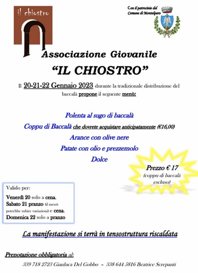 La storia racconta infatti che, per ringraziare la popolazione Montelparese per la sua collaborazione alla ricostruzione del Convento Agostiniano distrutto dal violento terremoto del 1703 (convento originariamente ubicato nella parte più alta del paese proprio accanto alla Chiesa di San Michele Arcangelo), i Frati organizzarono un pranzo a base di baccalà (un pasto che, probabilmente, aveva allora un costo abbordabile. Si dice che, all’epoca, il baccalà fosse chiamato “pasto dei poveri”)! Fu anche previsto che, a ognuno, andasse una porzione di baccalà del peso di UN COPPO (da qui U COPPU di oggi!): così era chiamata l’unità di misura di quel tempo che equivale a circa 250 grammi odierni. Insieme al baccalà venne distribuito anche pane e vino: esattamente come oggi!