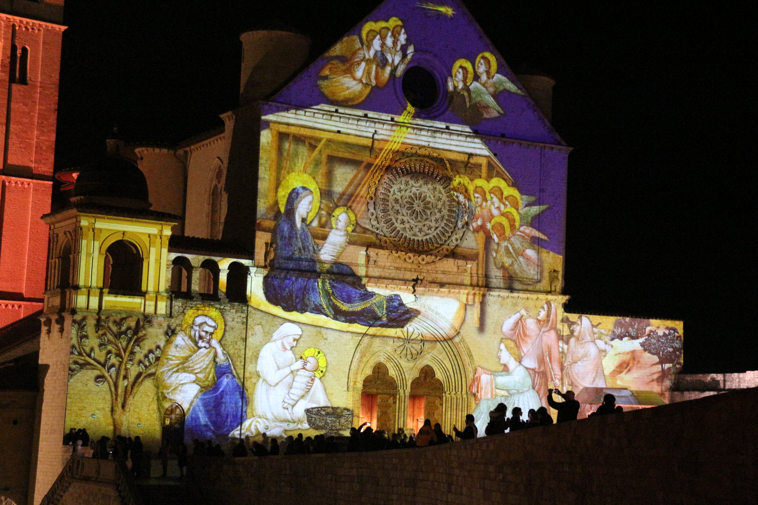 Con l’arrivo della sera, Assisi si è illuminata di stelle e cristalli di neve, mentre la Nati-vità di Giotto rivestiva la facciata della Basilica Superiore.