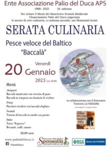 ACQUAVIVA PICENA – L’Ente Associazione Palio del Duca APS di Acquaviva Picena, presidente cav. Nello Gaetani, è felice di annunciare la prima serata culinaria dell’anno, “Serata del pesce veloce del Baltico, il baccalà”. Il calendario delle serate prevede per ogni mese la degustazione di piatti tipici preparati accuratamente dai vari ristoranti locali.
