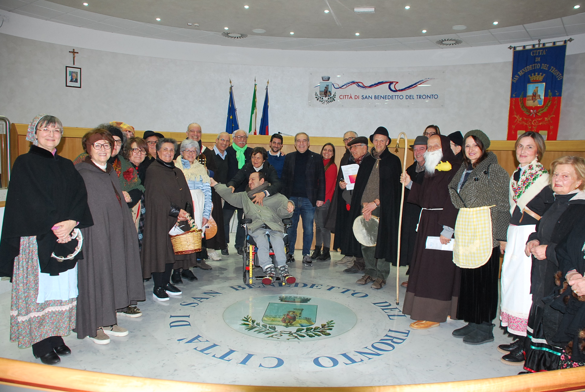 SAN BENEDETTO DEL TRONTO – Nel pomeriggio di lunedì 16 gennaio si è rinnovata in Municipio la tradizione della “Pasquella”. I “Cantori di Sant’Antonio”, ovvero una ventina di membri della corale “Riviera delle Palme” in abiti tradizionali, guidati dal maestro Fabrizio Urbanelli, hanno intonato i canti della tradizione popolare dinanzi al sindaco Antonio Spazzafumo e ad altri amministratori comunali intervenuti in sala consiliare.