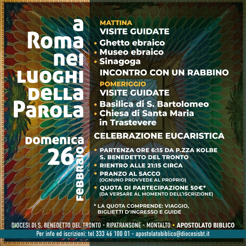 Il Servizio per l’apostolato biblico diocesano afferma: “Cogliamo l’occasione per presentare una nostra proposta per il 26 febbraio: una giornata a Roma che ha per tema la visita ad alcuni luoghi significativi in relazione alla Parola; tutte le informazioni sono nella locandina allegata”.