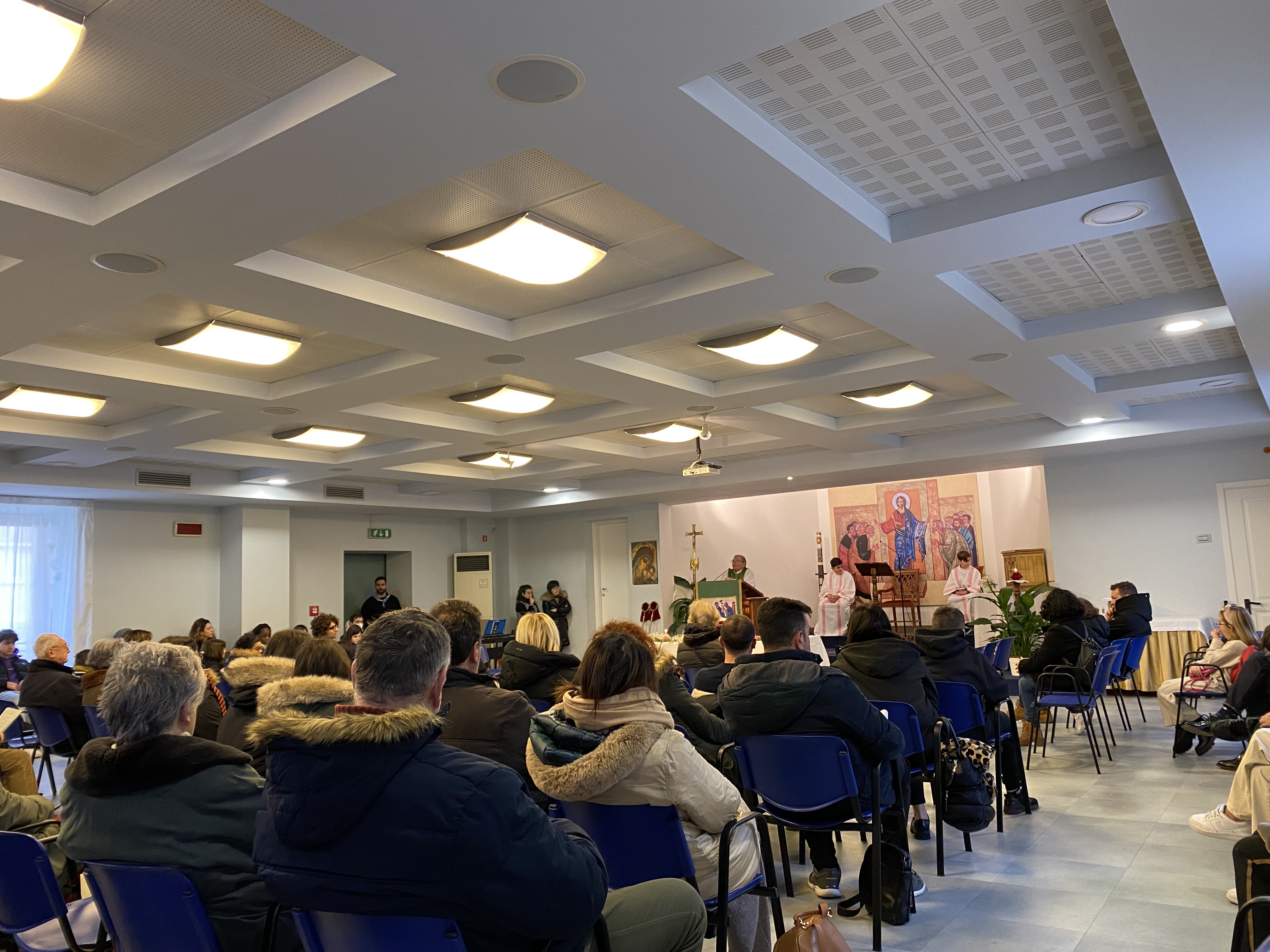 In foto mostriamo la grande affluenza di domenica 22 gennaio alla celebrazione delle 11,30 nella Sala Verdecchia. Il parroco ha spiegato e ricordato di essere stato “55 mesi” in un garage a Centobuchi nel suo precedente mandato e di aver trascorso seppur con tante difficoltà, i momenti più belli ed intensi del suo ministero pastorale proprio in quel luogo, in attesa che la nuova chiesa venisse costruita.