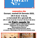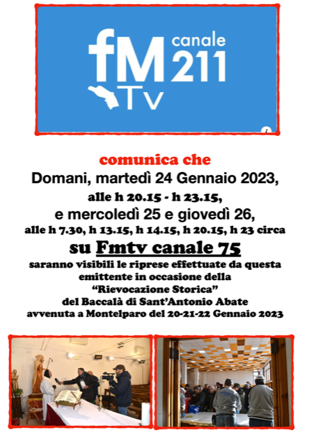 Per sottolineare l’importanza dell’evento anche quest’anno le telecamere di FM canale 211 TV, guidate dall’operatore Fabio Scatasta, hanno effettuato riprese dell’evento e intervistato, proprio ai piedi del simulacro di S. Antonio Abate, Don Giorgio Carini che ha spiegato i significati e la storia di questa eccezionale rievocazione. Gli operatori si sono diretti poi presso la zona di distribuzione del Baccalà (le registrazioni saranno mandate in onda martedì 24 gennaio alle ore 20.15 e 23.15 su Fmtv canale 75 per ripetersi poi mercoledì e giovedì alle ore 7.30, 13.15, 14.15, 20.15 e 23 circa.