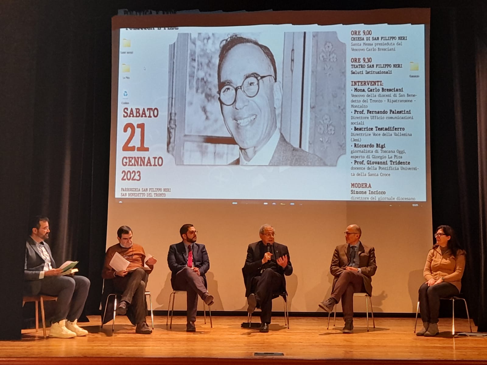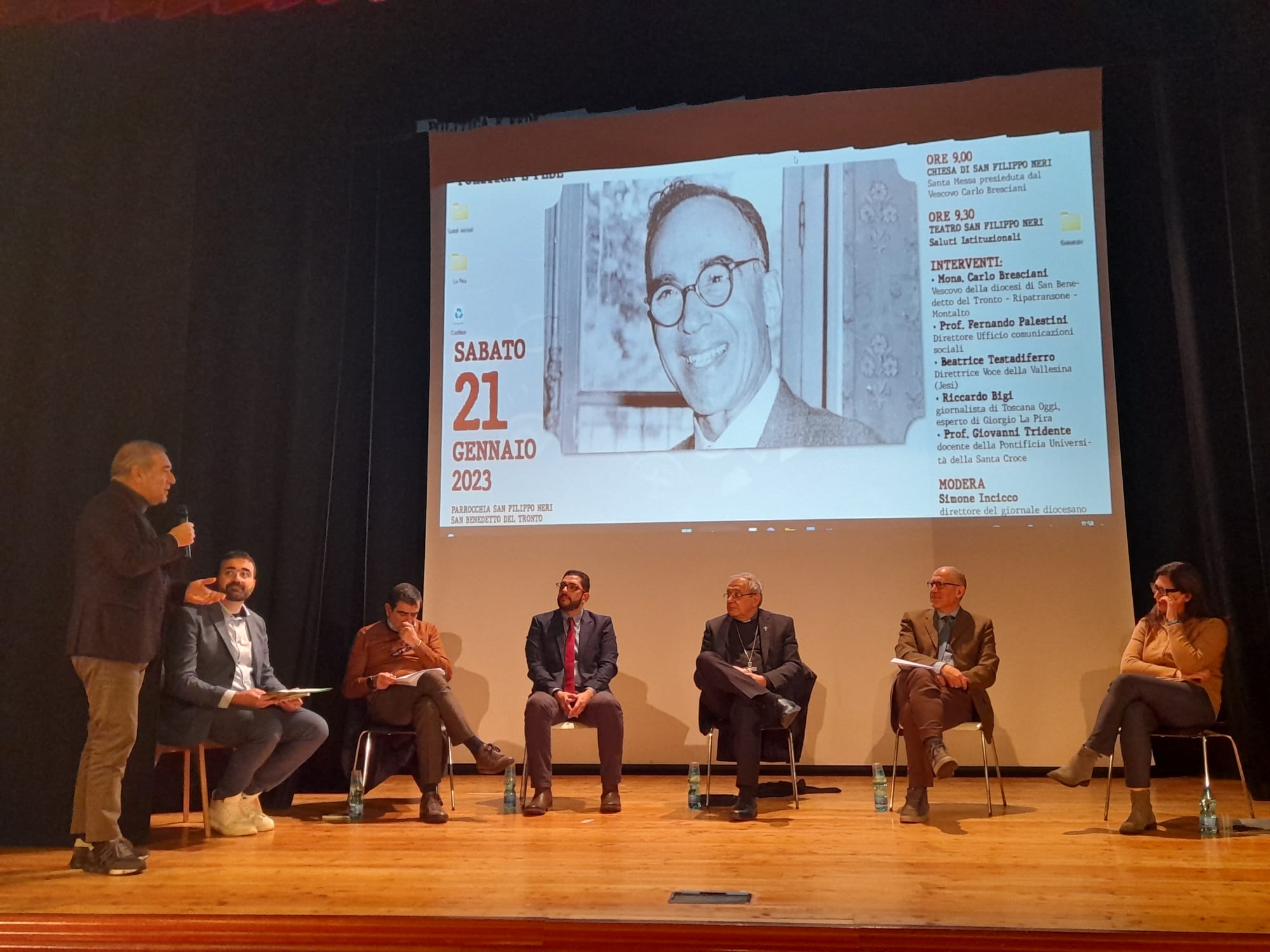DIOCESI – Si è svolto sabato 21 gennaio, alle ore 9:30, presso il teatro San Filippo Neri di San Benedetto del Tronto, il convegno dal titolo “Operatori di pace come Giorgio La Pira: tra giornalismo, politica e fede”. L’evento, organizzato dal giornale diocesano L’Ancora in occasione del decimo anniversario della nascita dell’edizione digitale, ha registrato la presenza di circa 100 persone e di tanti illustri relatori, tra cui: Mons. Carlo Bresciani, Vescovo della Diocesi di San Benedetto del Tronto – Ripatransone – Montalto; Fernando Palestini, Direttore dell’Ufficio Diocesano per le Comunicazioni Sociali; Beatrice Testadiferro, Direttrice della “Voce della Vallesina” che ha raccontato anche la sua esperienza di amministratrice comunale; Riccardo Bigi, giornalista di Toscana Oggi ed esperto di Giorgio La Pira, che ha ripercorso le tappe di vita del giornalista e politico dichiarato venerabile; Giovanni Tridente, docente della Pontificia Università della Santa Croce di Roma, che ha affrontato il delicato tema dell’intelligenza artificiale.