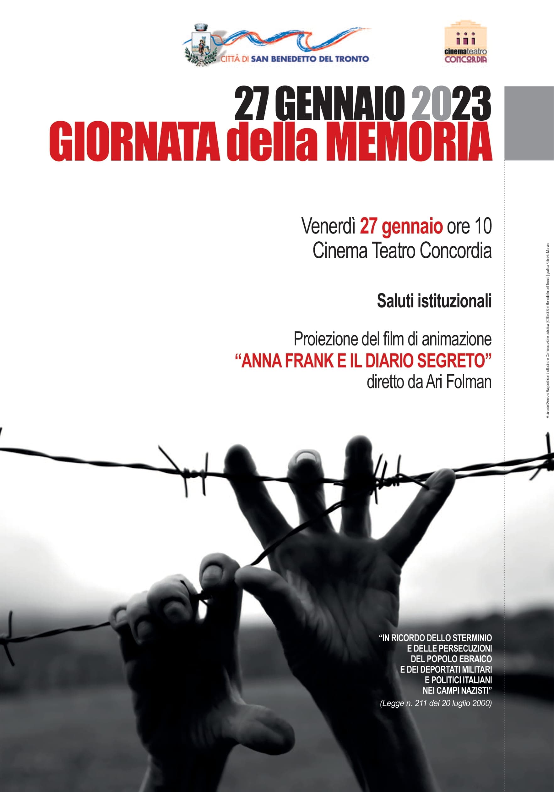 SAN BENEDETTO DEL TRONTO – In occasione della Giornata della Memoria, istituita dalla legge n. 211 del 20 luglio 2000 “in ricordo dello sterminio e delle persecuzioni del popolo ebraico e dei deportati militari e politici italiani nei campi nazisti”, la Città di San Benedetto proporrà venerdì 27 gennaio 2023, alle 10, al Cinema Teatro Concordia, la proiezione del film di animazione “Anna Frank e il diario segreto” di Ari Folman. In apertura sono previsti gli interventi istituzionali del sindaco Antonio Spazzafumo e dell’assessore alla cultura Lina Lazzari.