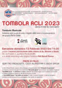 ASCOLI PICENO – Domenica 12 Febbraio il Teatrino della Parrocchia dei Ss. Simone e Giuda di Monticelli (AP) ospiterà la Tombola Acli 2023, evento all’insegna della solidarietà. Si tratterà di una Tombola Musicale che vedrà protagonisti gli allievi della scuola di canto “L’Angolo della Voce” di Cristina Paolini e i ragazzi di MeTe Canto.