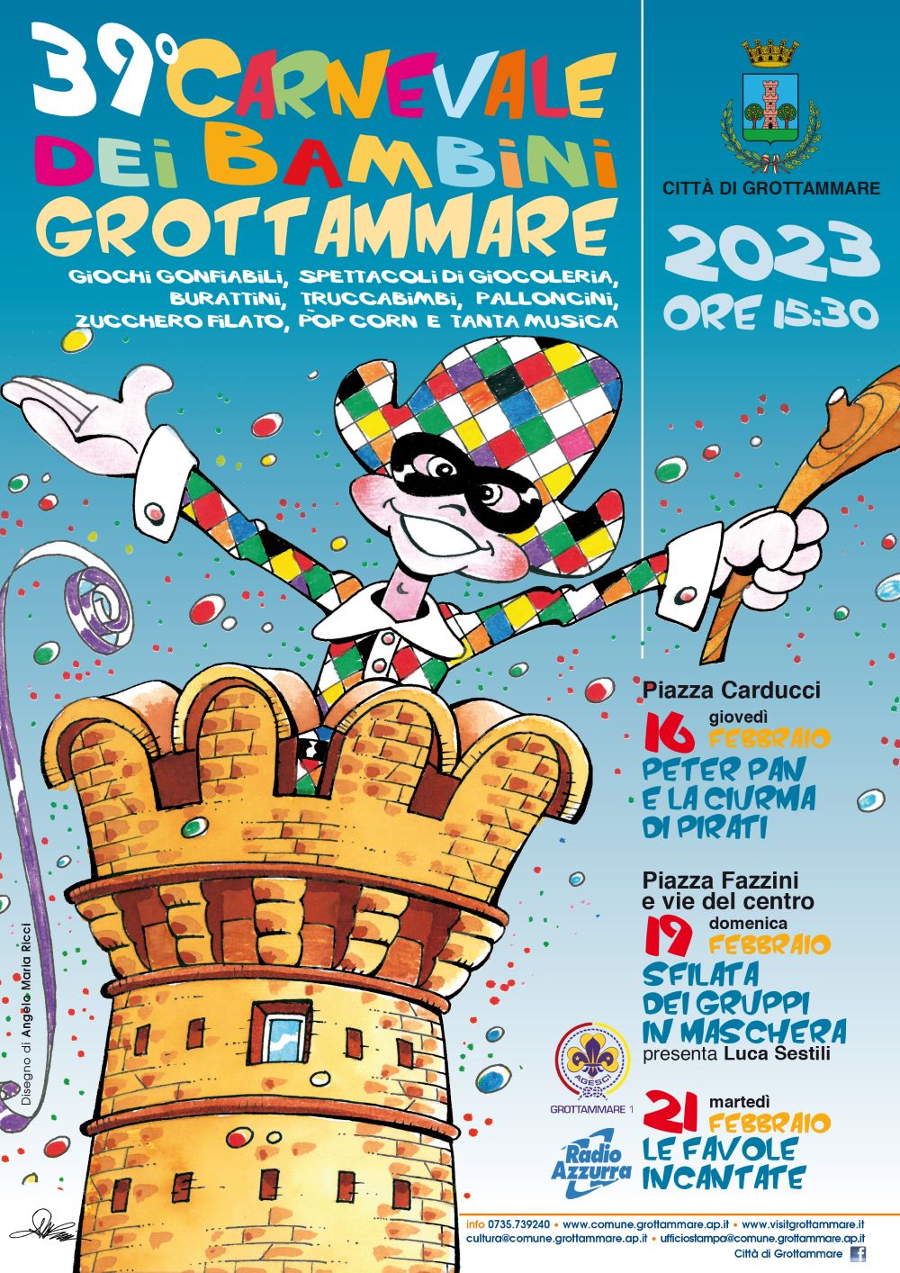GROTTAMMARE – Avverrà oggi pomeriggio, giovedì 16 febbraio, dalle ore 15:30 in poi, nel corso della festa di apertura del Carnevale di Grottammare in piazza Carducci, la presentazione delle proposte che andranno a comporre i 9 gruppi mascherati che sfileranno domenica nel centro cittadino per il 39° Carnevale dei Bambini, coinvolgendo circa 400 partecipanti. Previsti giochi gonfiabili e animazione a tema “Peter Pan e la ciurma dei pirati”.
