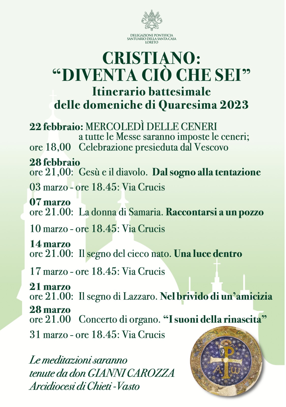 Dal 28 febbraio al 21 marzo, ogni martedì si terranno i “Quaresimali”, incontri di preghiera e riflessione in preparazione alla Santa Pasqua le cui meditazioni saranno tenute da Don Gianni Carozza della Diocesi di Chieti. Gli incontri potranno essere seguiti anche in streaming al Canale YouTube “Santa Casa Loreto”.
