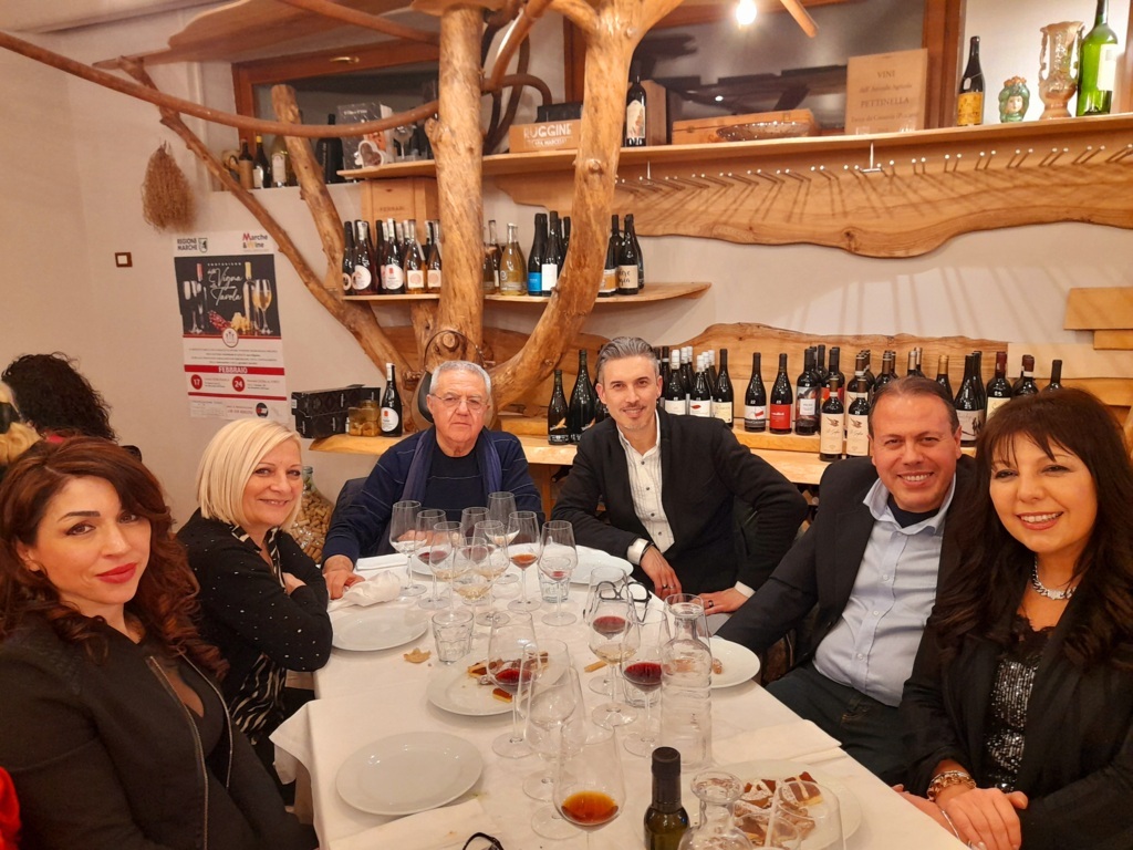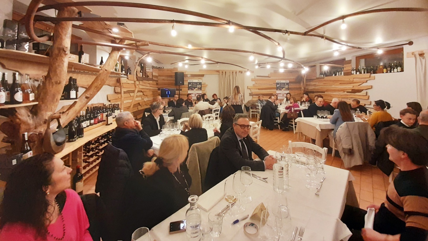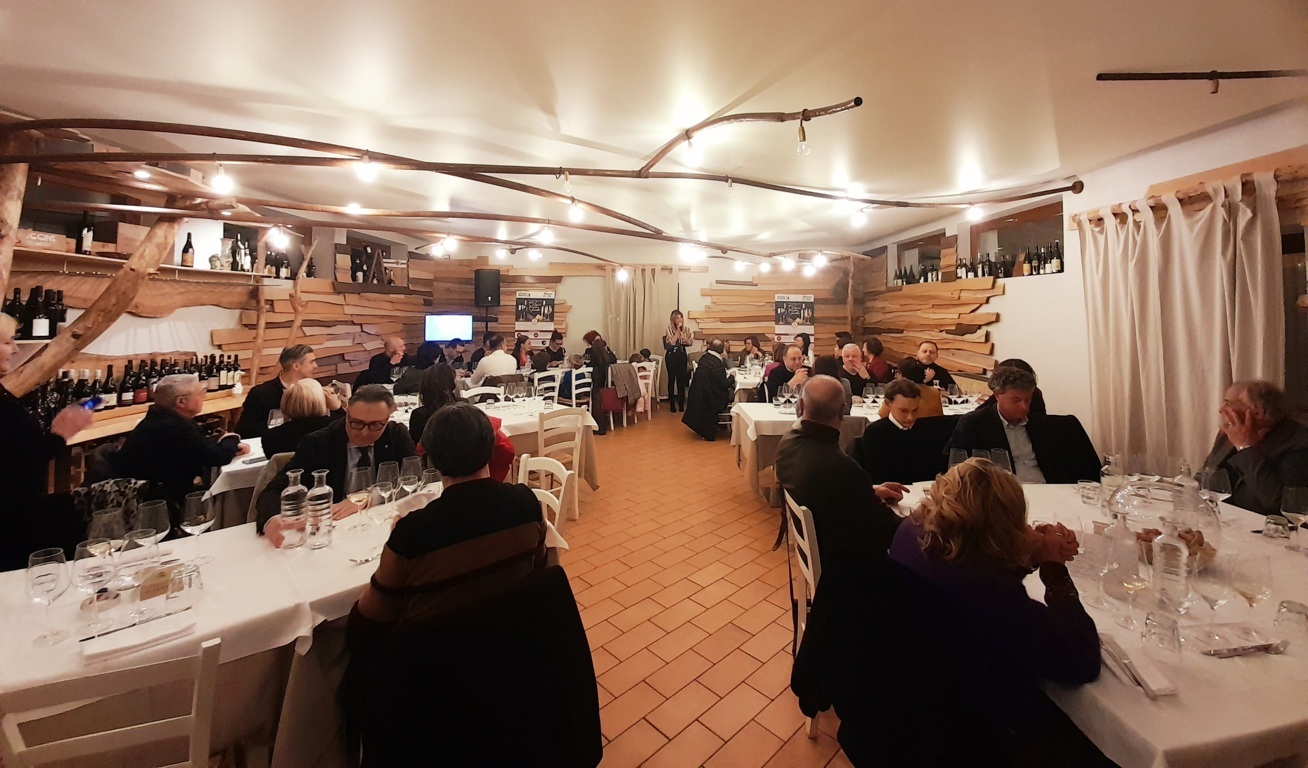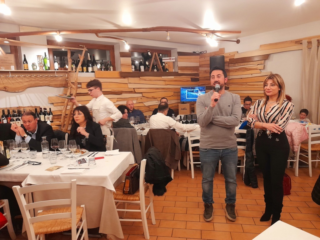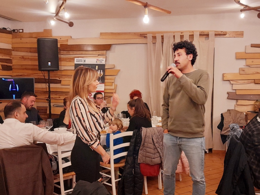 Quattro, invece, sono state le cantine promosse durante la cena dal Sommelier Ivan Millanaccio, appartenente all’AIS Marche (Associazione Italiana Sommelier della nostra regione) – delegazione di Ascoli Piceno: “Ad ogni piatto abbiamo abbinato un vino del nostro territorio. Per gli antipasti, che sono stati molto variegati, ho scelto una passerina abbastanza strutturata, la Raffa 2021 dell’Azienda Agricola Biologica Clara Marcelli di Castorano, che si è ben sposata con il loro gusto deciso. Con gli gnocchi ho proposto un pecorino, il Fiobbo 2020 dell’Azienda Agrobiologica Aurora di Offida che ha ben accompagnato il gusto intenso del sugo al cinghiale. Al secondo, invece, carne marchigiana cotta in padella ed accompagnata dalla polenta, ho abbinato il Koné, un Rosso Piceno Superiore 2019 dei Vigneti Vallorani di Colli del Tronto e Castorano, che vanta 18 mesi di affinamento in barrique ed un ulteriore periodo di maturazione di 12 mesi in bottiglia. Gli ospiti hanno molto apprezzato l’equilibrio sia del vino sia dell’abbinamento proposto. Oltre alle eccellenze delle cantine che abbiamo ospitato stasera, ho utilizzato anche altre bevande locali: infatti, al dolce ho abbinato, oltre al vino cotto dell’Azienda Mestichì, anche un assaggio di Anice Verde di Castignano dell’Azienda Terre dei Calanchi Piceni, un presidio Slow Food del nostro territorio”.