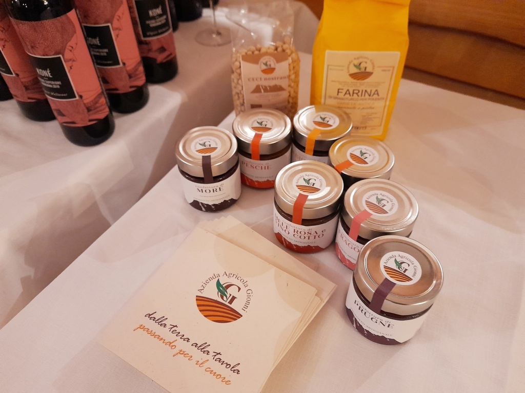 Sei le aziende agroalimentari che hanno fornito le materie prime per la cena: Azienda Agricola Mestechì di Castignano, Bosco d’Oro di Ascoli Piceno, Zafferano Piceno di Acquaviva Picena, Macelleria Antonio Filotei di Pescara del Tronto, Cartofaro Agribiologica di Ascoli Piceno, Patasibilla di Montegallo e Azienda Agricola Gionni di Comunanza. Prima, durante e dopo la cena, sono stati operativi alcuni piccoli stand nella sala d’ingresso dove gli ospiti intervenuti hanno potuto ammirare, assaggiare ed acquistare i prodotti utilizzati come materie prime per il menù della serata, parlando direttamente con i titolari delle aziende.