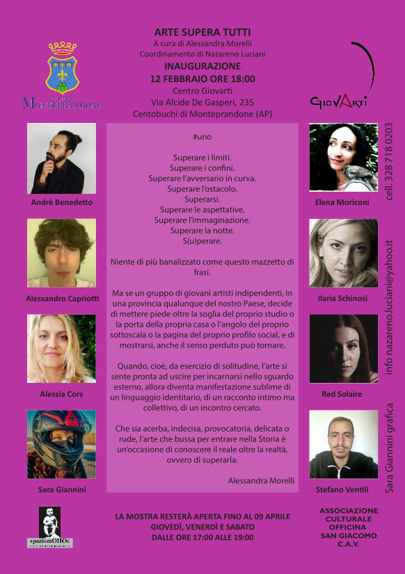 MONTEPRANDONE – Prosegue con un discreto successo di pubblico la mostra d’arte contemporanea “ArteSuperaTutti” inaugurata domenica 12 Febbraio 2023 ed ospitata presso la sala esposizioni del GiovArti Centro culturale a Centobuchi di Monteprandone. La collettiva, che è stata curata da Alessandra Morelli, porta alla ribalta otto artisti con loro opere inedite che arricchiscono il panorama culturale del nostro territorio: Andrè Benedetto, Alessandro Capriotti, Alessia Cors, Sara Giannini, Elena Moriconi, Ilaria Schinosi, Red Solaire, Stefano Ventilii.