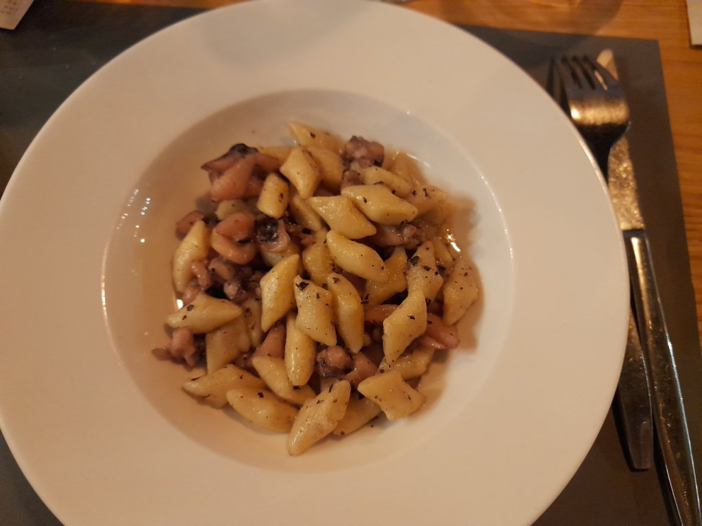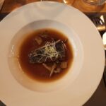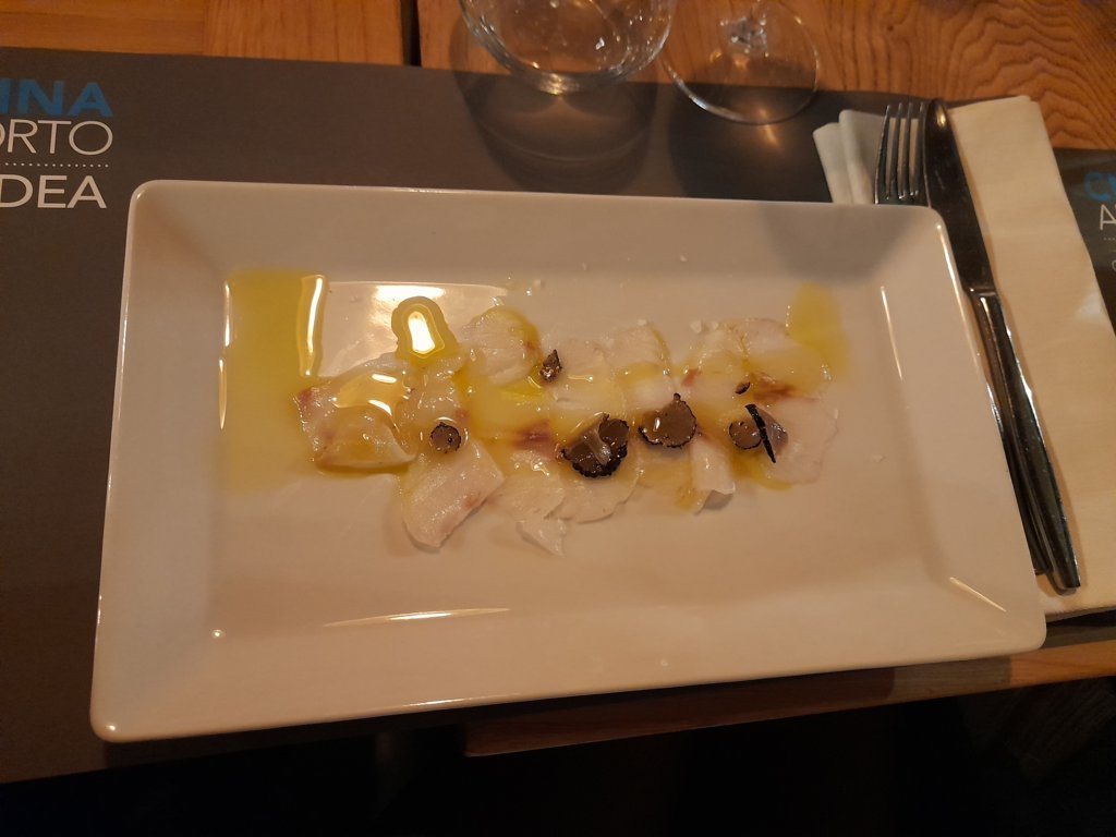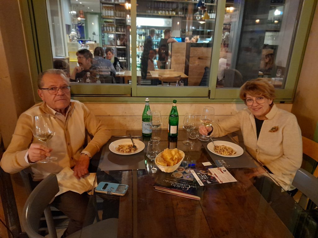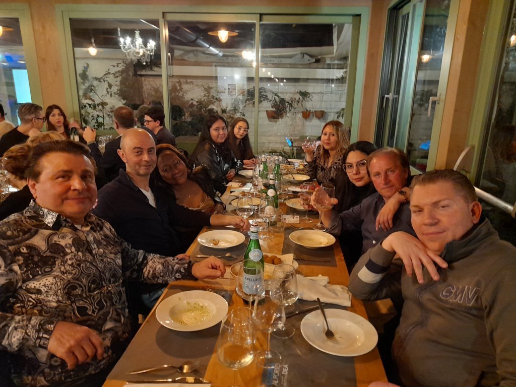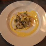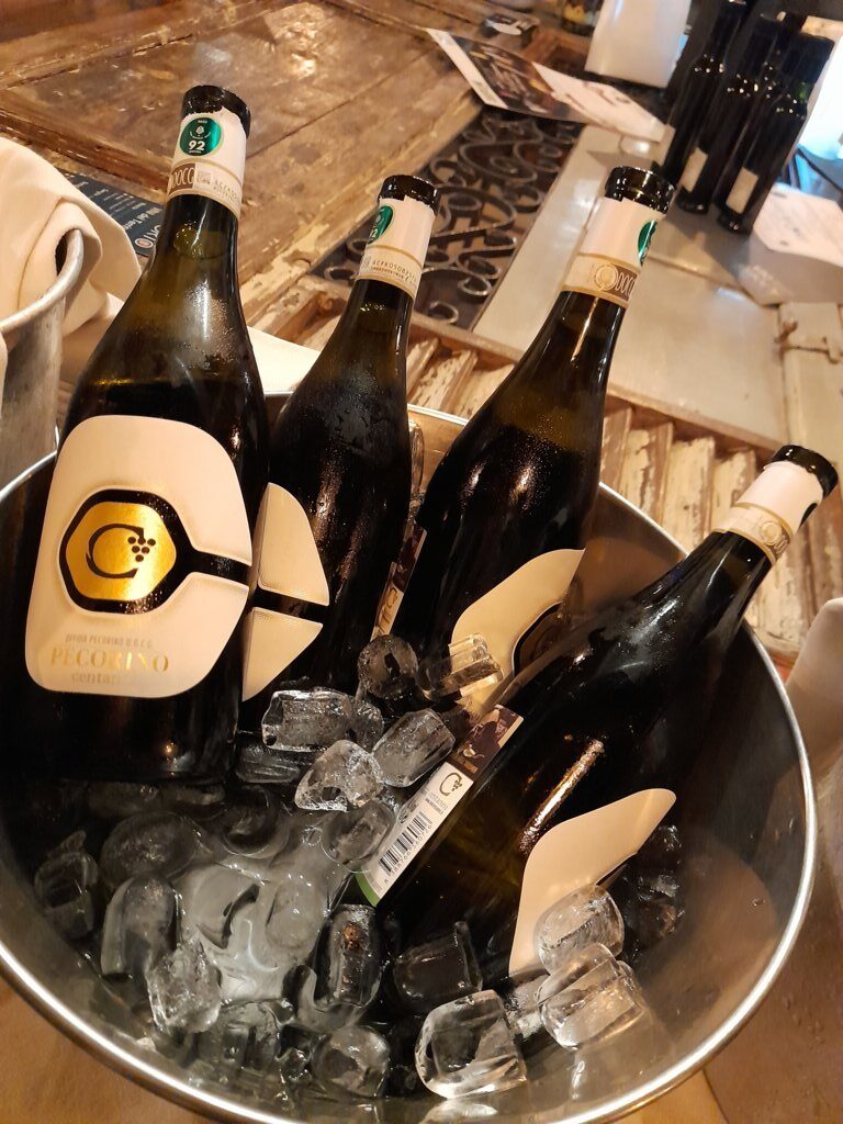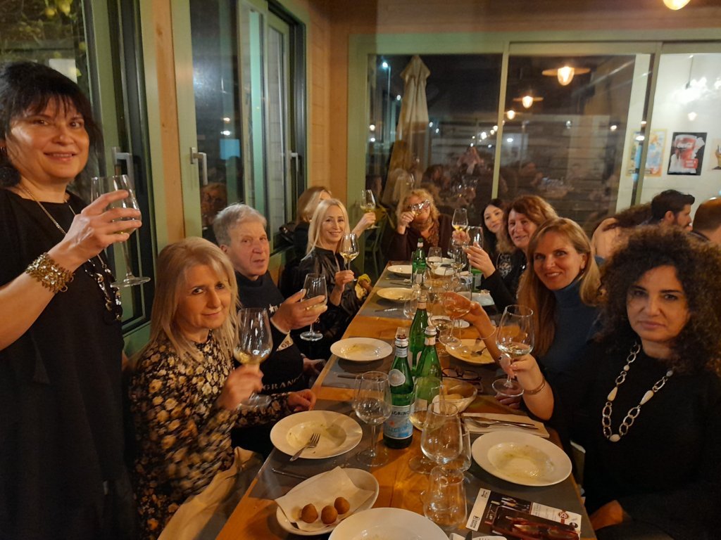 Tre le aziende enologiche che sono state protagoniste durante la cena: l’Azienda Agricola Terra Fageto di Pedaso, l’Azienda Agricola Biologica Centanni Giacomo di Montefiore dell’Aso e la Società Agricola Castrum Morisci di Moresco. È stato il Sommelier Ivan Millanaccio, appartenente all’AIS Marche (Associazione Italiana Sommelier della nostra regione) – delegazione di Ascoli Piceno – a scegliere i vini da abbinare ad ogni piatto. Queste le sue parole: “La cena, preparata dallo Chef Diplomato Mauro Gussoni, è stata molto ricca. Questi gli antipasti: carpaccio di spigola al tartufo nero e sale di Maldon, crudité di gambero rosa con stracciatella allo zafferano e granella di pistacchio, tagliatella di seppia su crema di patate al lime e pesto di prezzemolo ed infine olive all’ascolana di pesce. Con una tale varietà di piatti ho abbinato una passerina Marche IGT dell’Azienda Terra Fageto, un Letizia 2022, che, provenendo da una vendemmia recente, è caratterizzata da un bel profumo, ma allo stesso tempo, essendo supportata da una bella struttura, si è ben sposata con gli antipasti e in particolare con il carpaccio. Abbinato al primo ho proposto un vino dell’Azienda Centanni, un Offida DOCG 2021, un pecorino in purezza la cui struttura prorompente si è perfettamente combinata con un piatto abbastanza consistente e dal gusto deciso come sono gli gnocchetti con seppie al tartufo bianco. Insieme al secondo poi ho fatto assaggiare agli ospiti il rosato 326 della Cantina Castrum Morisci, un Marche IGT delicato e non molto marcato ma con un bel nerbo, che ha fatto risaltare il gusto intenso dell’ombrina con infusione di funghi. Infine ho deciso di accompagnare il dolce, una torta alle nocciole con crema all’anice e pesche sciroppate, un ghiaccio di anice verde di Castignano dell’Azienda Terre dei Calanchi Piceni.