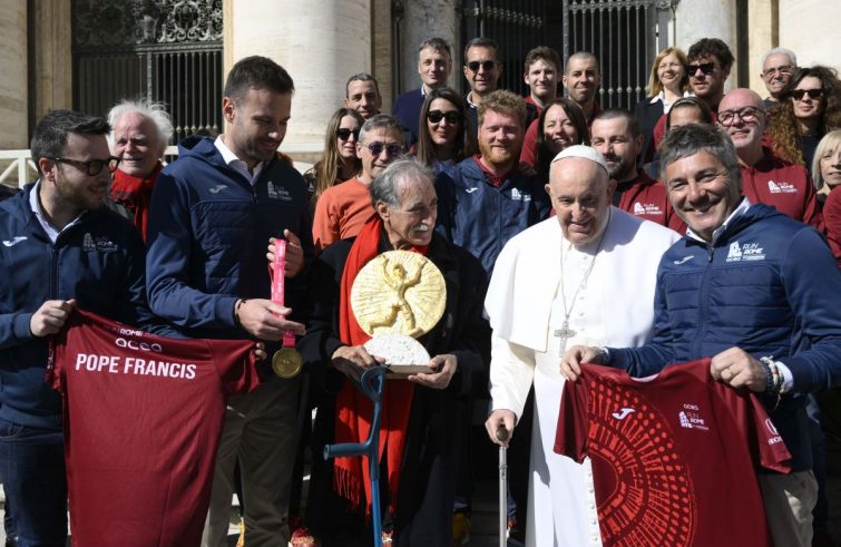 Una mattinata storica per Acea Run Rome The Marathon che ha incontrato Papa Francesco in piazza San Pietro, udienza possibile grazie all’amicizia e impegno di Athletica Vaticana. “Avete la maratona, buona maratona a tutti i partecipanti”, il saluto e l’augurio del Pontefice al quale è stata donata la t-shirt ufficiale della maratona, personalizzata con “Pope Francis”. Il Pontefice ha benedetto simbolicamente la medaglia ufficiale e la Coppa degli ultimi che sarà donata all’ultimo podista che domenica 19 marzo transiterà in piazza Pio XII-piazza San Pietro, come simbolo di perseveranza, tenacia e di eguaglianza con i vincitori primi classificati. Presente l’autore della Coppa, Erwin Alfredo Bendfeldt, che vive nella casa d’accoglienza Centro Caritas di Roma. Una vita molto particolare la sua, fuggito dal Guatemala quando c’era la dittatura, gli hanno sparato alla testa. Credendolo morto fu gettato in una fossa comune dove lo ha trovato e salvato un prete arrivato lì per benedire i cadaveri. Ora vive a Roma assistito dalla Caritas e da qualche buon amico.