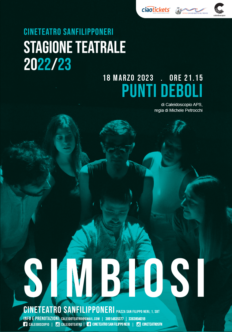 SAN BENEDETTO DEL TRONTO – Si conclude la stagione teatrale “Simbiosi” al Cineteatro San Filippo Neri di San Benedetto del Tronto. In prima assoluta sabato 18 marzo alle ore 21.15 va in scena “Punti Deboli”, la nuova produzione originale di Caleidoscopio APS.