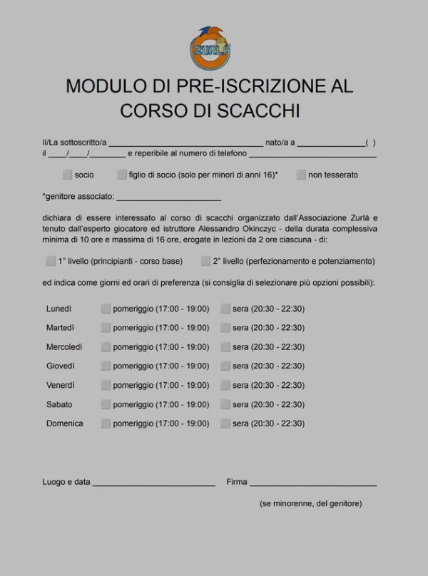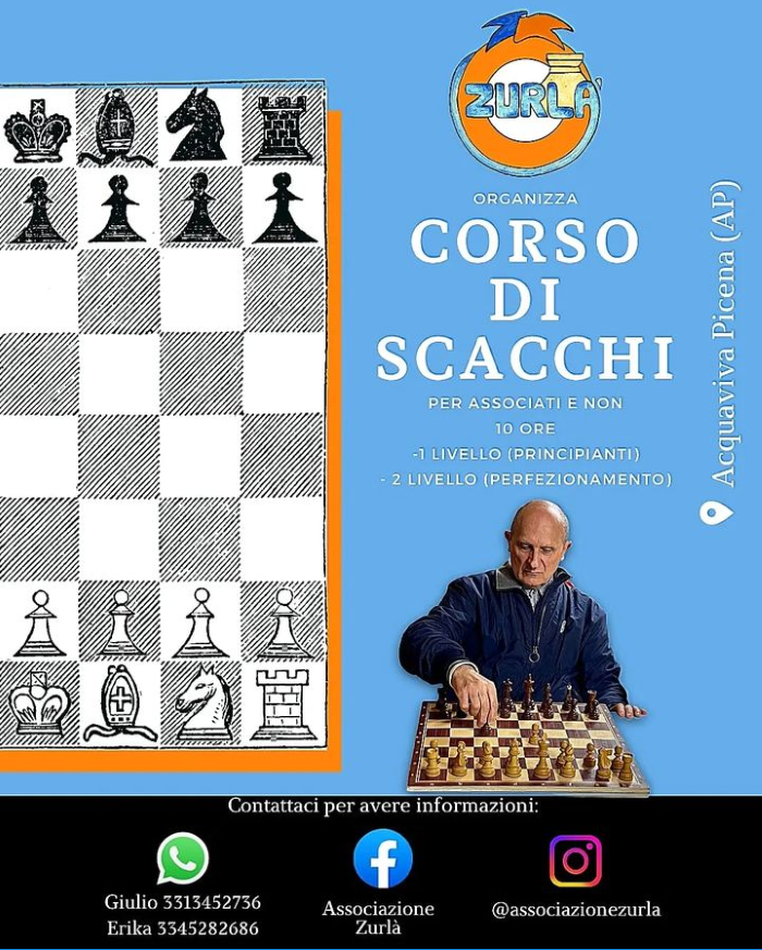 ACQUAVIVA PICENA – L’Associazione “Zurlà” di Acquaviva Picena propone un corso di scacchi rivolto ad associati e non associati. Il corso, il quale è composto da dieci ore, è suddiviso in primo livello e secondo livello, il primo livello è dedicato ai principianti, mentre il secondo livello è di perfezionamento. L’Associazione in collaborazione con il maestro di scacchi Alessandro Okinczyc, ricorda che possono partecipare al corso: adulti, ragazzi e bambini. Gli scacchi, gioco di strategia tra i più popolari al mondo tanto da essere citato anche nella Divina Commedia di Dante: “L’incendio suo seguiva ogne scintilla; ed eran tante, che ‘l numero loro più che ‘l doppiar de li scacchi s’inmilla”, è consigliabile per allenare la mente, per migliorare la memoria e aumentare la logica, inoltre giocare a scacchi favorisce lo sviluppo dell’indipendenza e del senso di responsabilità. Per ulteriori informazioni è possibile contattare l’Associazione “Zurlà” sui social, Facebook e instagram, oppure tramite Giulio 3313452736 o Erika 3345282686. Agli stessi contatti potete mandare ilmodulo di iscrizione.