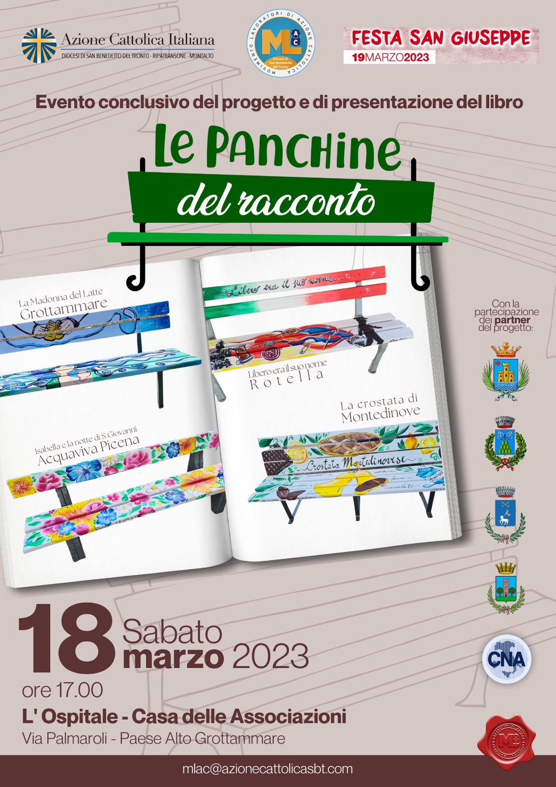 La presentazione si inserisce inoltre nella Festa di S. Giuseppe cara al Mlac, a ricordare l’importanza del raccontare tra generazioni, della memoria e dei legami da curare. Alla presentazione saranno presenti i rappresentanti delle amministrazioni comunali coinvolte e la Cna partner del progetto, i responsabili nazionali e regionali del Mlac insieme a tutta l’equipe diocesana e all’Azione Cattolica di San Benedetto.