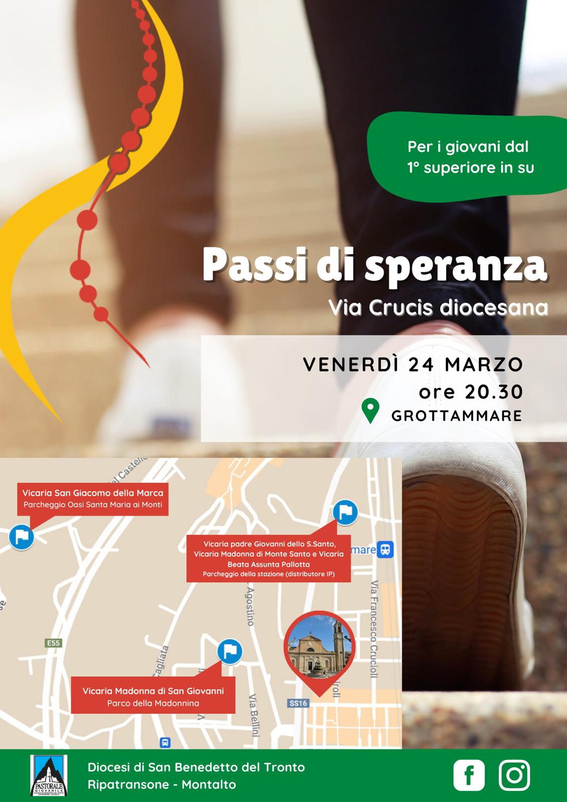 DIOCESI – Si terrà venerdì 24 marzo, alle ore 20:30, a Grottammare, l’appuntamento dal titolo “Passi di speranza” rivolto a tutti i Giovanissimi e i Giovani della nostra Diocesi. L’incontro, che sarà presieduto dal vescovo Carlo Bresciani, è organizzato dal Servizio Diocesano di Pastorale Giovanile.