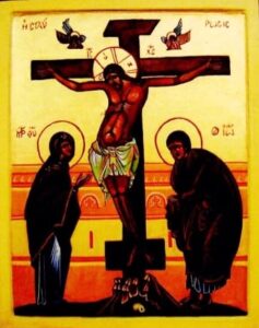 La rappresentazione non sembra tanto una descrizione, bensì una preghiera in atto: è, infatti, come se fossimo invitati ad ascoltare i sentimenti dei personaggi rappresentati e ci accorgiamo che è una preghiera di sofferenza, ma allo stesso tempo piena d’amore. Protagonista assoluta è la Croce, che si innalza al centro dell’immagine ed è piantata sulla terra, posizionata sul Golgota. Il sangue di Gesù giunge fin sulla testa, come a dire che il sacrificio di Gesù, quindi il Suo amore per noi, ci avvolge tutti, avvolge tutta la comunità. Le varie ferite che si trovano sul corpo di Gesù assumono un andamento ondulato, come se fossero sgorghi d’acqua, un elemento altamente simbolico che, in un contrsto di morte, è un richiamo alla vita e alla Resurrezione. Poi ci sono le altre figure intorno a Gesù: prima di tutto Maria, una madre sofferente, che sembra quasi sfiorare la mano del Figlio come per strapparlo a quel dolore, ma che, al contrario, con il movimento del suo corpo, sembra assecondare quello di Gesù; poi anche Giovanni, testimone silenzioso, tutto reclinato verso Gesù, come se facesse un inchino che allo stesso tempo è di sofferenza e di adorazione. Sullo sfondo si ergono le mura della città di Gerusalemme che Gesù ha vinto: il loro colore caldo, infatti, ricorda l’alba, ad indicare che Gesù è il nuovo sole che si innalza, è l’inizio di una nuova vita. E ci pensiamo così a tutti quei muri così duri da scardinare, quelli che sono nel nostro cuore e che sono le resistenze ad accogliere Gesù nella nostra vita. Infine non possiamo non notare il volto di Gesù che quasi accenna un sorriso. Egli ha sperimentato la fame, la sofferenza, la derisione, l’ingiustizia, è quindi piegato dal dolore; ma al tempo stesso la sua figura è maestosa e delicata: sembra che anche Lui stia per staccarsi dalla Croce come per iniziare una danza, la danza di una nuova vita”.