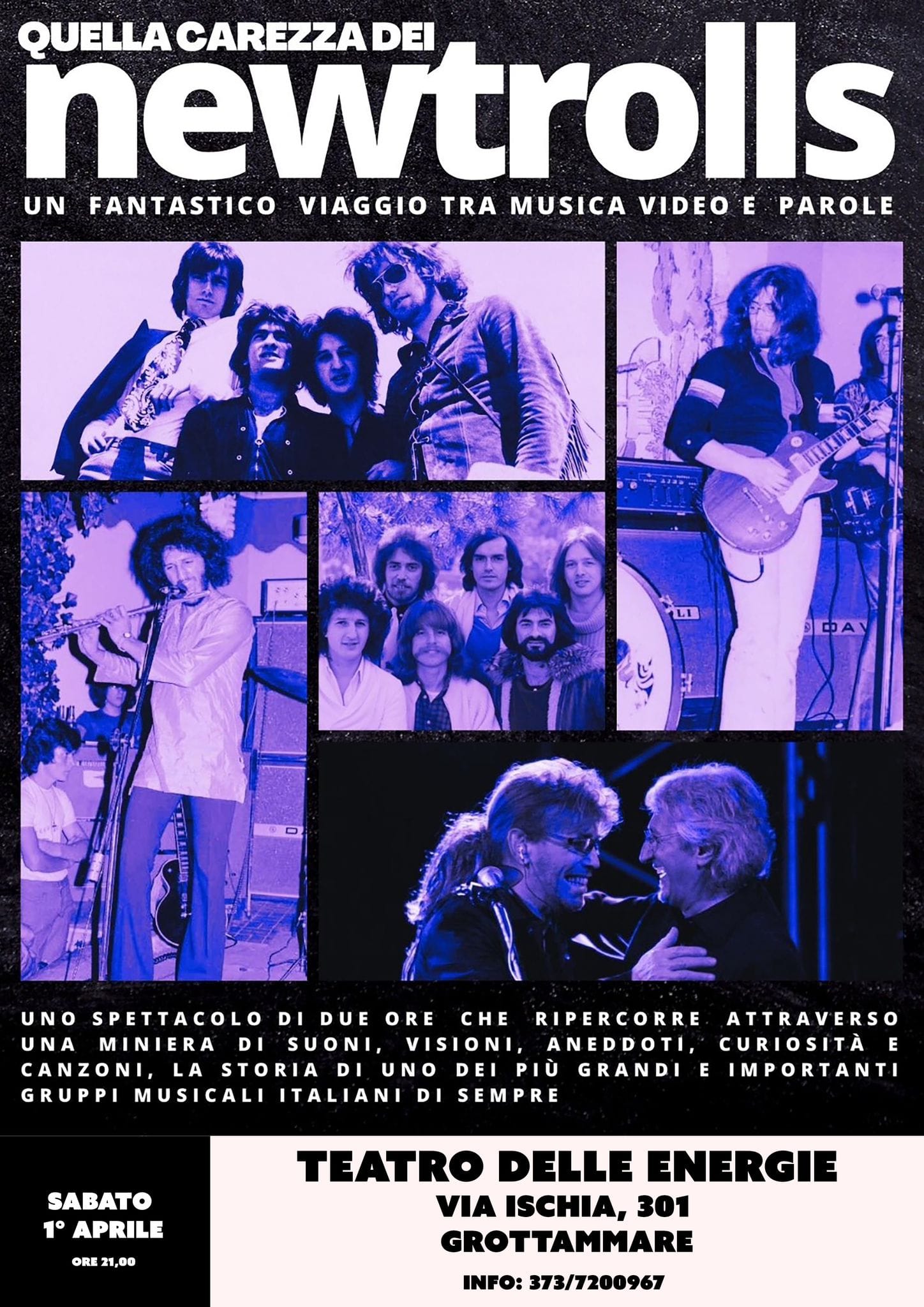 GROTTAMMARE – Sabato 1° aprile e non è uno scherzo, andrà in scena al Teatro delle Energie di Grottammare alle ore 21.15 “Quella carezza dei New Trolls” ovvero un “fantastico viaggio” in cui parole, suoni e immagini racconteranno la storia di uno dei gruppi italiani più importanti, influenti ed innovativi di sempre del panorama musicale italiano e non solo.