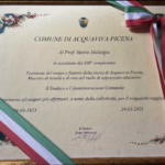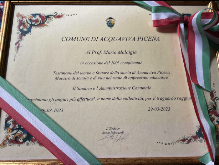 Il professore Mario ricorda gli anni di insegnamento con molta emozione, il suo fine non era solo quello di fornire nozioni per istruire i suoi alunni, ma il suo desiderio era anche quello di far fiorire la vocazione personale di ogni singolo ragazzo; i bambini e i giovani gli erano così a cuore che fece erigere per il Natale un grande albero per i bambini poveri, per tutti quelli che non potevano permettersene uno proprio, nelle loro case; il giorno di Natale e dell’Epifania consegnava i regali per i piccoli bisognosi. Sua anche l’idea della realizzazione di un giornalino scolastico “La Rocca”, per il quale ricevette tanti complimenti da tutta Italia e riconoscimenti da testate giornalistiche. Che il Signore ricompensi il cav. Malaigia per il suo impegno profuso agli altri. Il sindaco di Acquaviva Picena Sante Infriccioli, insieme ai componenti della giunta, Marianna Spaccasassi e Piera Rossi, ha portato a nome di tutta l’Amm.ne Com.le, un messaggio di auguri al festeggiato, il sindaco a tal proposito ha detto: “Sono stato molto felice di aver condiviso con il professor Malaigia e i suoi famigliari, questo importante giorno che fa entrare, a pieno titolo, il professore, tra gli acquavivani più longevi. Un cittadino speciale visto l’impegno dedicato al nostro paese sia come sindaco che come insegnante. A lui e ai suoi cari ancora tanti auguri da tutta la cittadinanza per questo traguardo”.