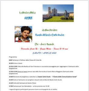 Queste le parole di Rosario Brucciolo, presidente del gruppo di Azione Cattolica Parrocchiale: “All’inizio dell’anno catechistico abbiamo sposato il tema proposto dall’ACR per il 2023, ovvero ‘Ragazzi, che squadra!’ ed abbiamo impostato tutti gli incontri con i ragazzi del nostro gruppo seguendo i suggerimenti che ci vengono forniti dalle guide dell’Azione Cattolica. In particolare abbiamo vissuto alcuni momenti forti come l’Avvento, il Mese della Pace e ora anche la Quaresima approfondendo il tema della convocazione. Abbiamo preso in prestito dallo sport questo termine per indicare che anche noi siamo convocati da Dio per giocare la nostra partita, quella della vita, non con l’obiettivo di vincere una gara, bensì con quello di sfruttare i nostri talenti per renderci utili al mondo e per diffondere il Vangelo. In questo percorso che abbiamo fatto insieme abbiamo conosciuto le figure di alcuni santi e beati che hanno risposto bene a questa convocazione. Tra tutte le storie ascoltate ha suscitato particolare interesse quella del Beato Carlo Acutis, un giovane di pochi anni più grande di loro di cui abbiamo visto numerosi video. Ci mancava solo di andarlo a trovare! Così è nata l’idea di organizzare un pellegrinaggio ad Assisi per visitare i luoghi che il giovane Carlo ha frequentato, come ad esempio la Basilica di San Francesco e la Basilica di Santa Chiara, oltre al luogo in cui è esposta la sua salma. L’incontro pertanto servirà a completare un percorso di catechesi iniziato in autunno; ma, oltre a fare catechismo in esterna, vivremo anche momenti di riflessione e preghiera, momenti ludici e momenti di socializzazione“.