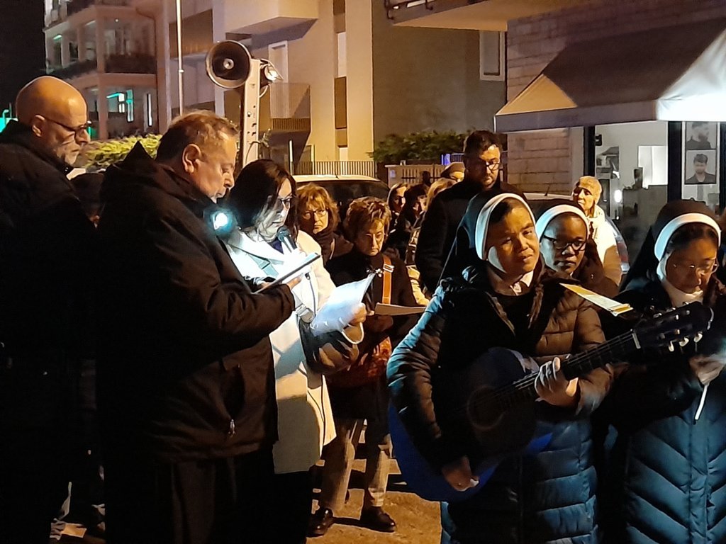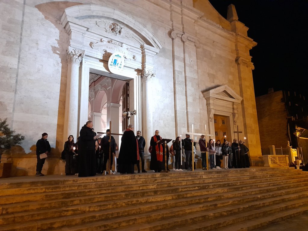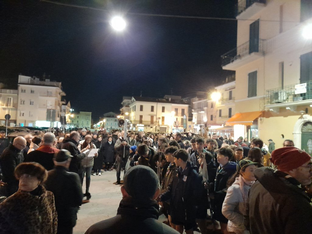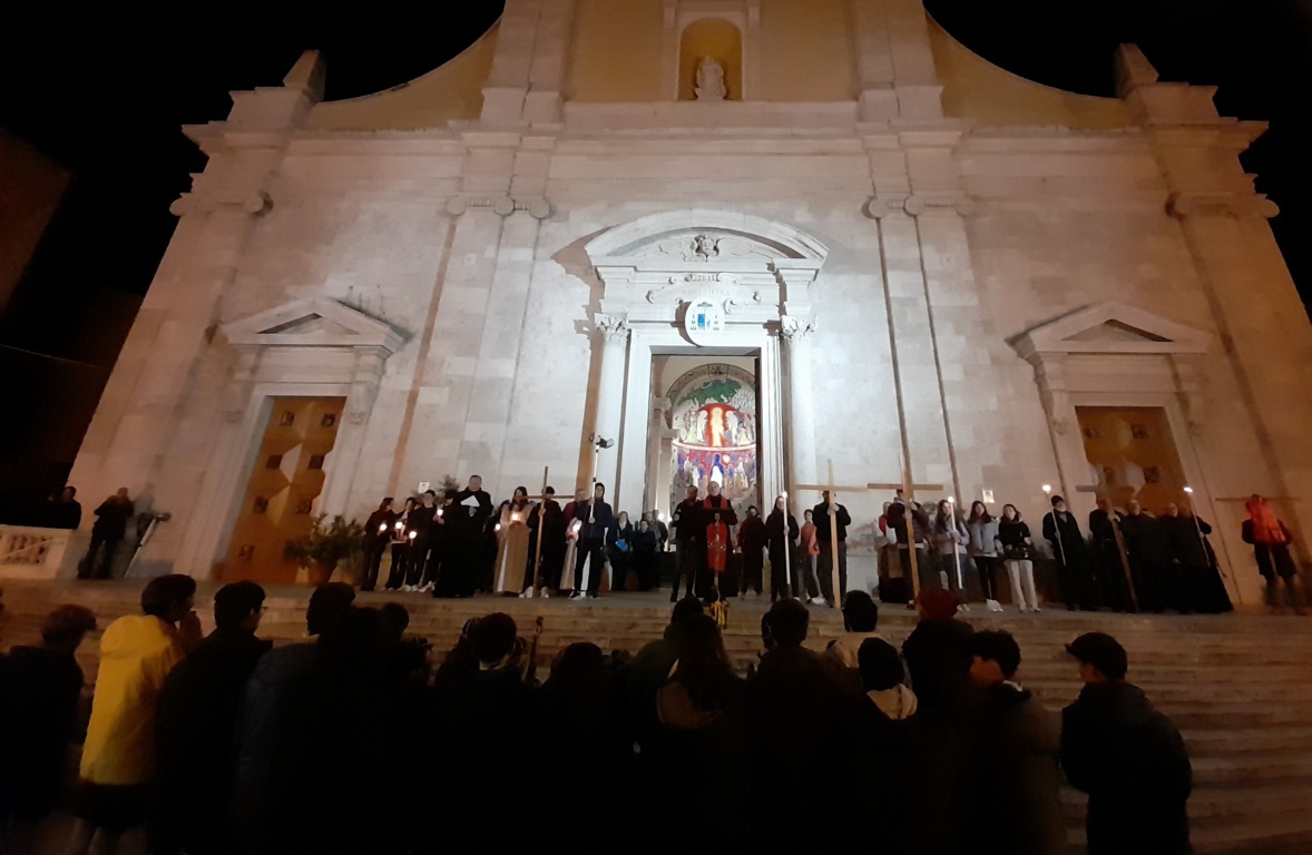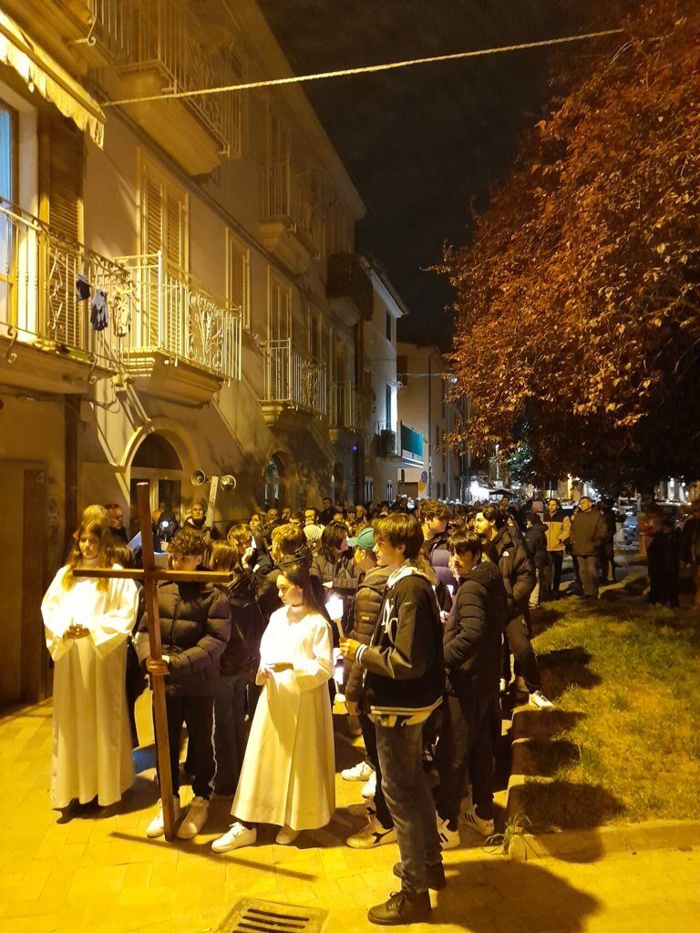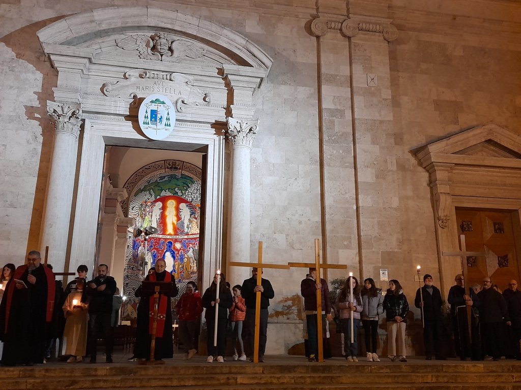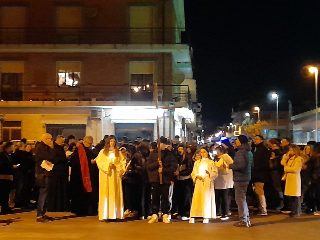 DIOCESI – Le rigide temperature di questa Settimana Santa non hanno impedito ai fedeli sambenedettesi di partecipare numerosi ai riti del Triduo Pasquale. In particolare, nel giorno del Venerdì Santo, 7 aprile 2023, oltre all’azione liturgica delle ore 15:00 in cui si è ripercorsa la Passione di Cristo secondo il Vangelo di Giovanni, si è svolta anche alle ore 21:00 la consueta Via Crucis per le strade della città. Le comunità parrocchiali sambenedettesi appartenenti alla Vicaria Padre Giovanni dello Spirito Santo, dopo aver ripercorso le quattordici Stazioni della Passione e Morte di Gesù, si sono date appuntamento davanti alla Cattedrale Santa Maria della Marina. Così, presso piazza Nardone, intorno alle ore 22:00, si sono ritrovati i fedeli di San Filippo Neri e Santa Maria della Marina, di San Benedetto Martire e Madonna del Suffragio, di San Pio X e Sant’Antonio di Padova ed infine di San Giuseppe. Presenti il vescovo Carlo Bresciani e i sacerdoti delle varie parrocchie: don Patrizio Spina, don Guido Coccia, don Gianni Croci, don Ulderico Ceroni, don Gianni Capriotti, padre Massimo Massimi, padre Mario Amadeo.