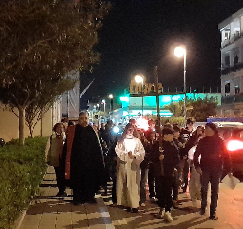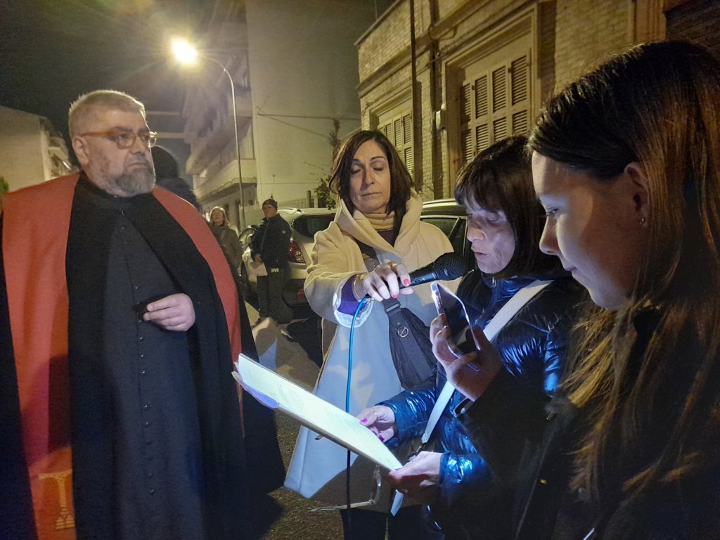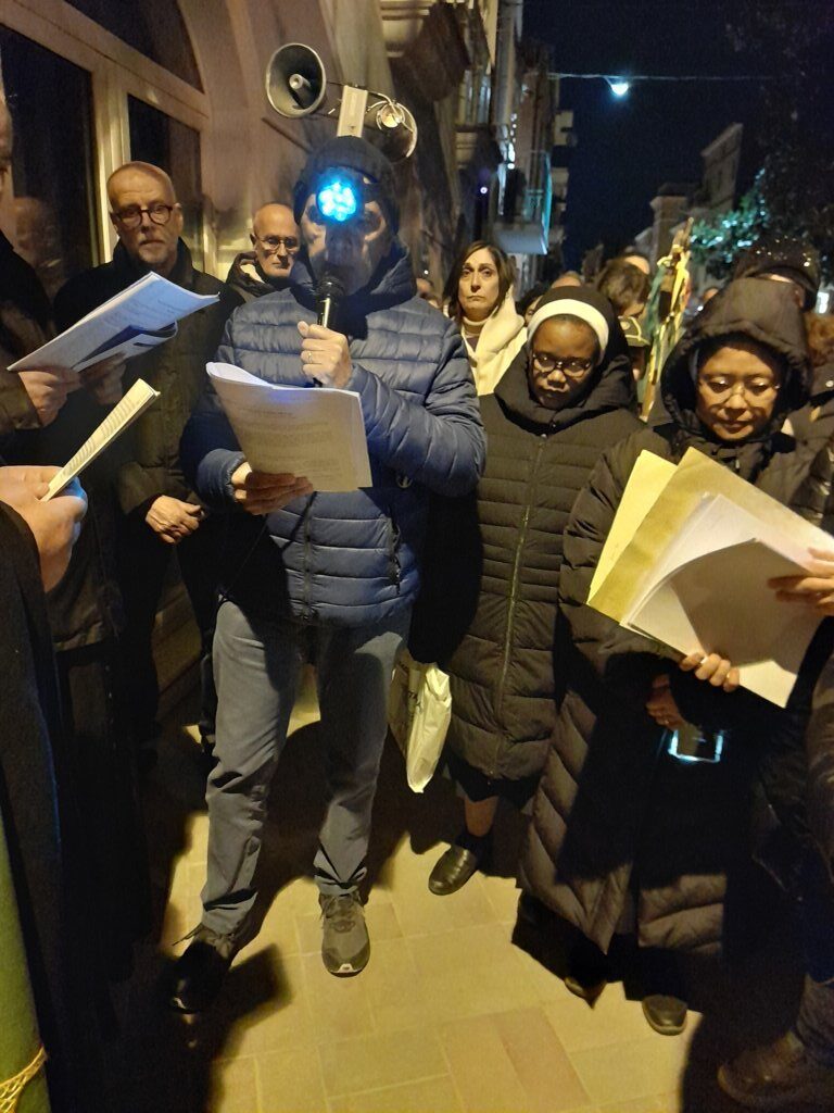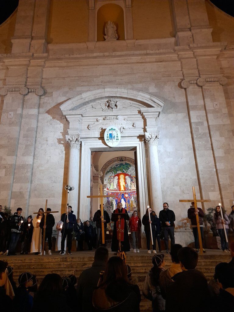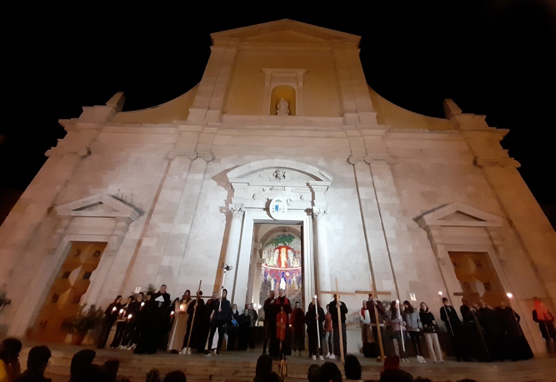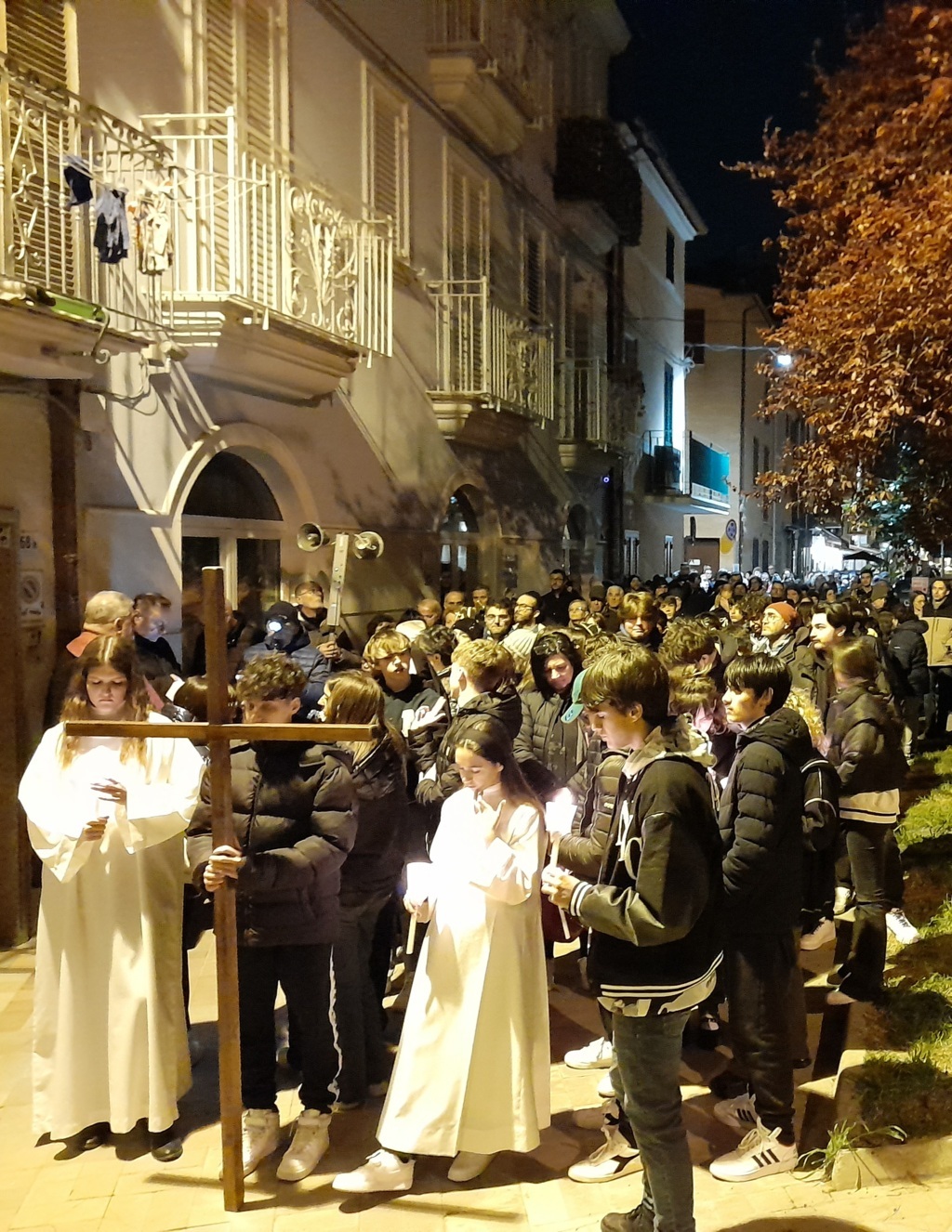 DIOCESI – Le rigide temperature di questa Settimana Santa non hanno impedito ai fedeli sambenedettesi di partecipare numerosi ai riti del Triduo Pasquale. In particolare, nel giorno del Venerdì Santo, 7 aprile 2023, oltre all’azione liturgica delle ore 15:00 in cui si è ripercorsa la Passione di Cristo secondo il Vangelo di Giovanni, si è svolta anche alle ore 21:00 la consueta Via Crucis per le strade della città. Le comunità parrocchiali sambenedettesi appartenenti alla Vicaria Padre Giovanni dello Spirito Santo, dopo aver ripercorso le quattordici Stazioni della Passione e Morte di Gesù, si sono date appuntamento davanti alla Cattedrale Santa Maria della Marina. Così, presso piazza Nardone, intorno alle ore 22:00, si sono ritrovati i fedeli di San Filippo Neri e Santa Maria della Marina, di San Benedetto Martire e Madonna del Suffragio, di San Pio X e Sant’Antonio di Padova ed infine di San Giuseppe. Presenti il vescovo Carlo Bresciani e i sacerdoti delle varie parrocchie: don Patrizio Spina, don Guido Coccia, don Gianni Croci, don Ulderico Ceroni, don Gianni Capriotti, padre Massimo Massimi, padre Mario Amadeo.