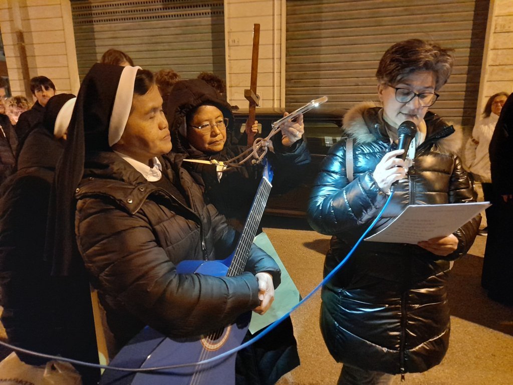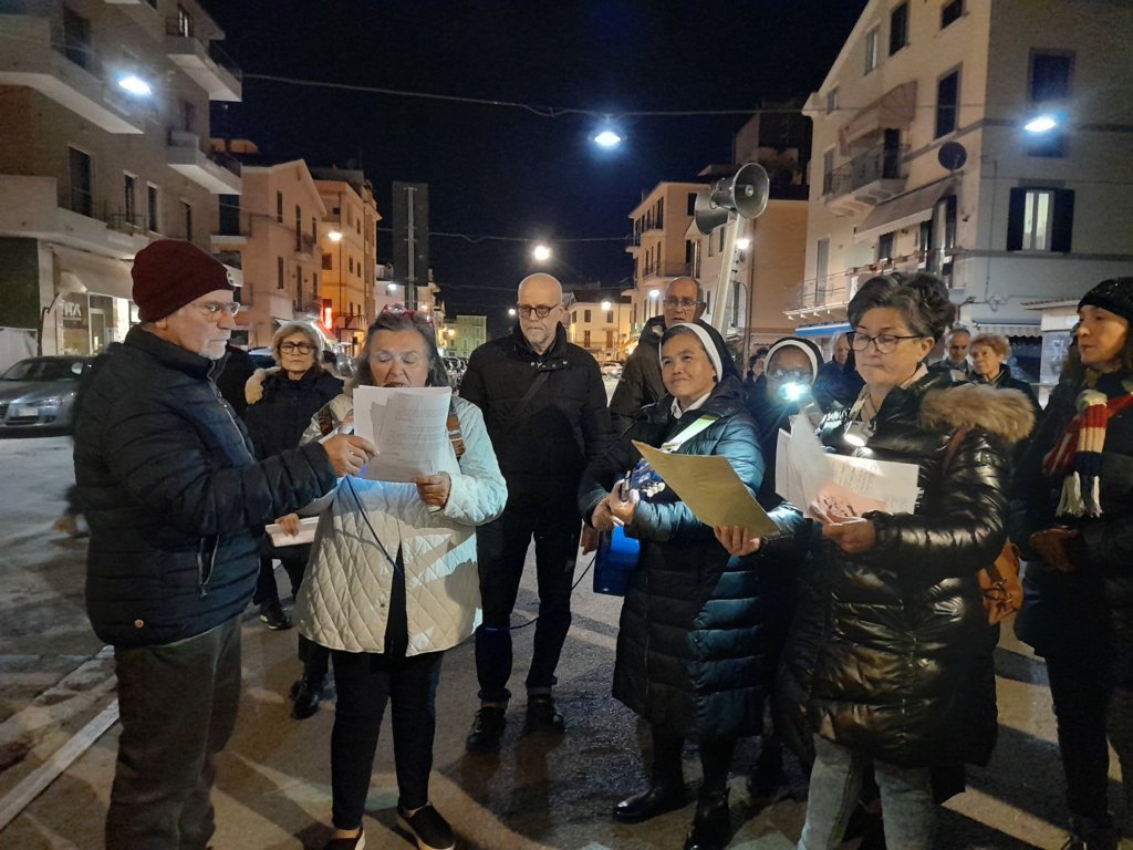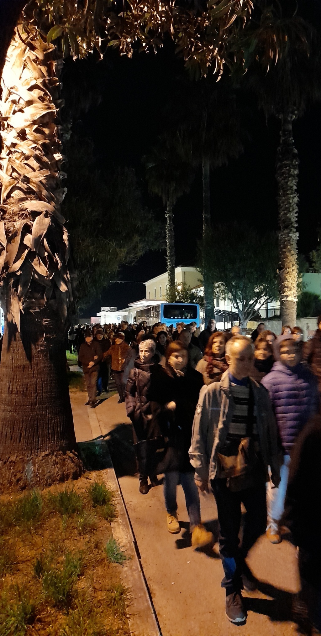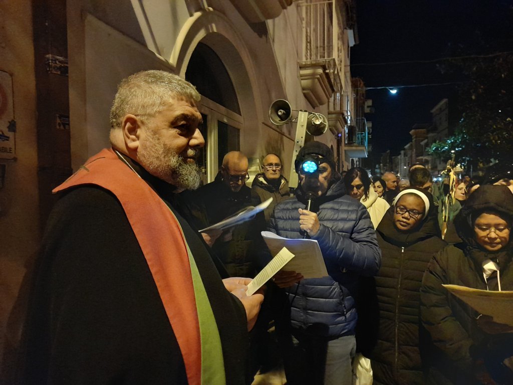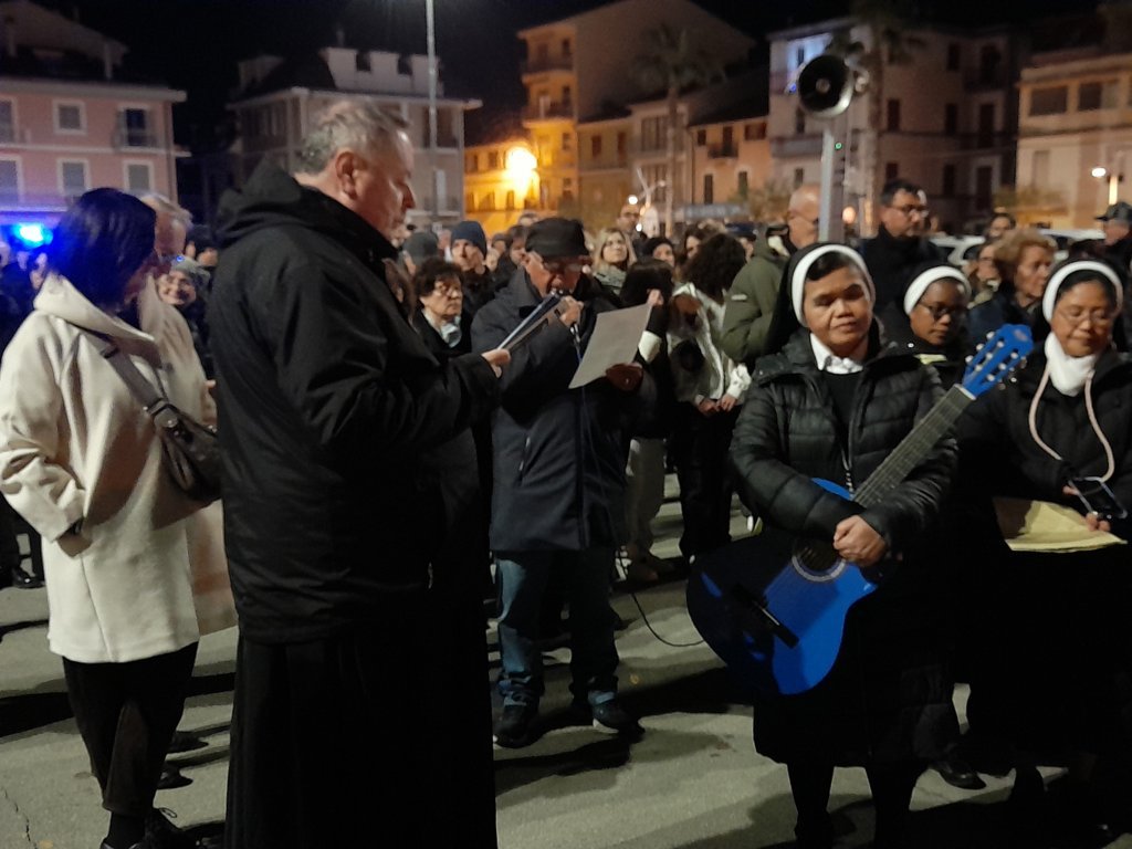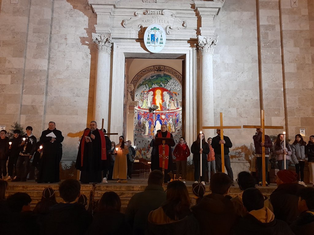 DIOCESI – Le rigide temperature di questa Settimana Santa non hanno impedito ai fedeli sambenedettesi di partecipare numerosi ai riti del Triduo Pasquale. In particolare, nel giorno del Venerdì Santo, 7 aprile 2023, oltre all’azione liturgica delle ore 15:00 in cui si è ripercorsa la Passione di Cristo secondo il Vangelo di Giovanni, si è svolta anche alle ore 21:00 la consueta Via Crucis per le strade della città. Le comunità parrocchiali sambenedettesi appartenenti alla Vicaria Padre Giovanni dello Spirito Santo, dopo aver ripercorso le quattordici Stazioni della Passione e Morte di Gesù, si sono date appuntamento davanti alla Cattedrale Santa Maria della Marina. Così, presso piazza Nardone, intorno alle ore 22:00, si sono ritrovati i fedeli di San Filippo Neri e Santa Maria della Marina, di San Benedetto Martire e Madonna del Suffragio, di San Pio X e Sant’Antonio di Padova ed infine di San Giuseppe. Presenti il vescovo Carlo Bresciani e i sacerdoti delle varie parrocchie: don Patrizio Spina, don Guido Coccia, don Gianni Croci, don Ulderico Ceroni, don Gianni Capriotti, padre Massimo Massimi, padre Mario Amadeo.