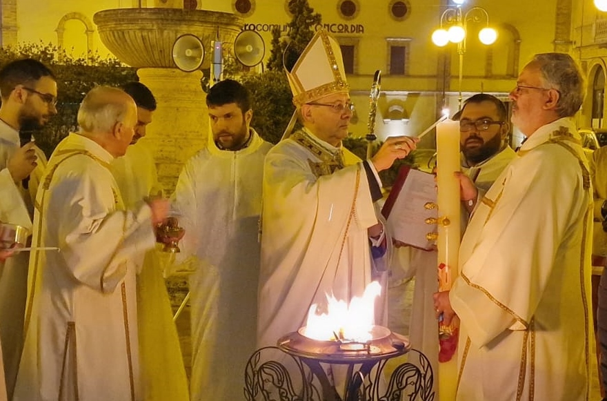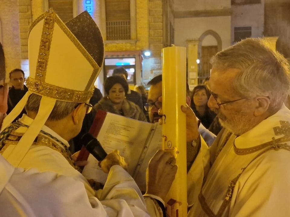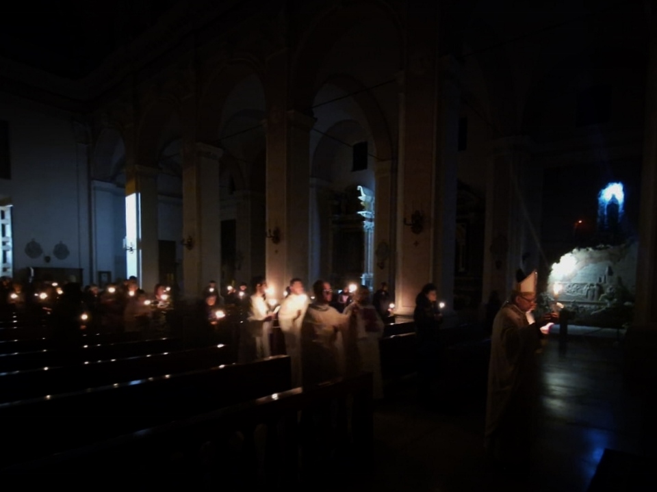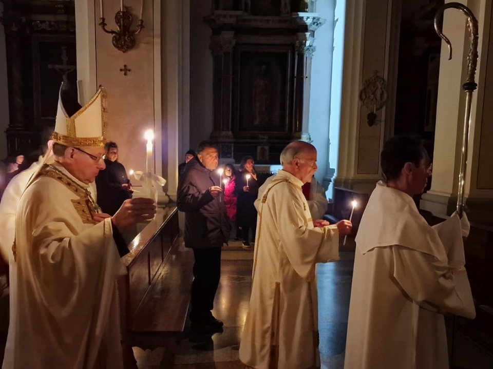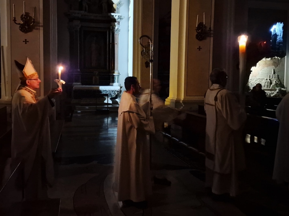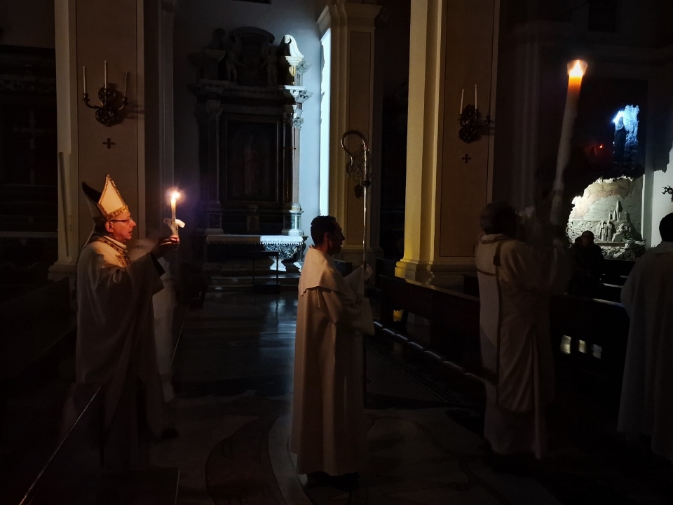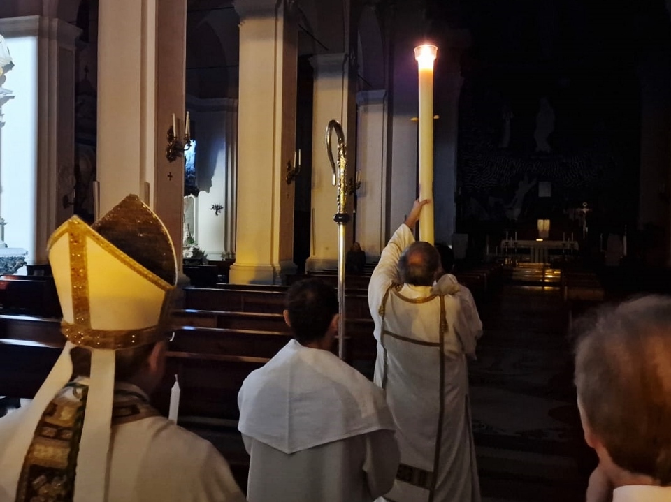 Nella piazza il Vescovo Carlo ha benedetto il fuoco e ha acceso il cero pasquale. Entrati in chiesa, i fedeli, partendo dal vescovo, hanno acceso le candele cantando per tre volte “Luce di Cristo, rendiamo grazie a Dio”. Una volta accese tutte le luci della chiesa, il diacono Walter Gandolfi ha proclamato l’Exultet, antichissimo inno scritto da Sant’Agostino.