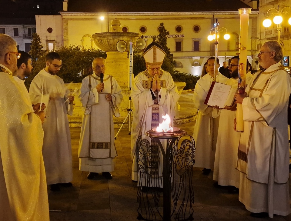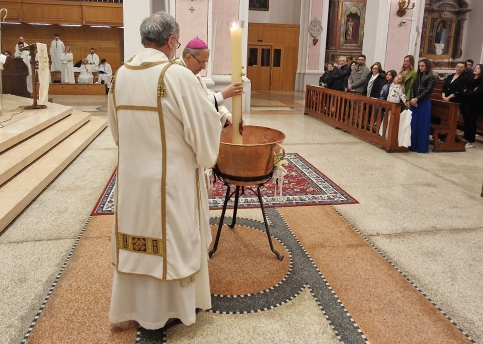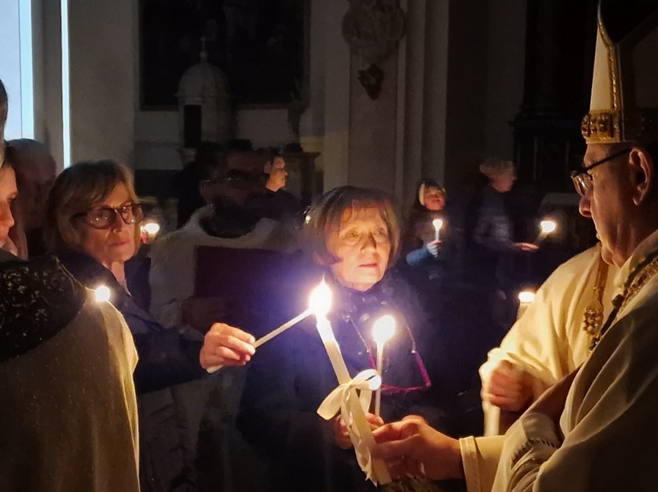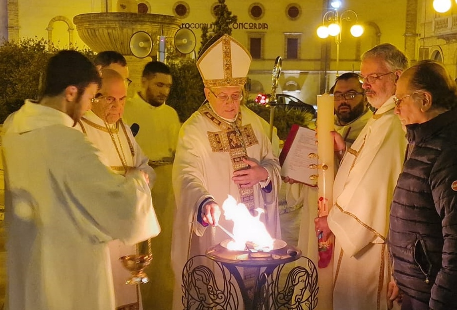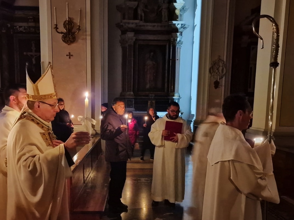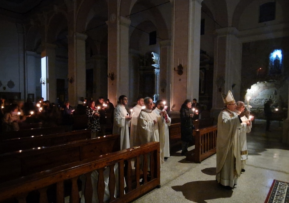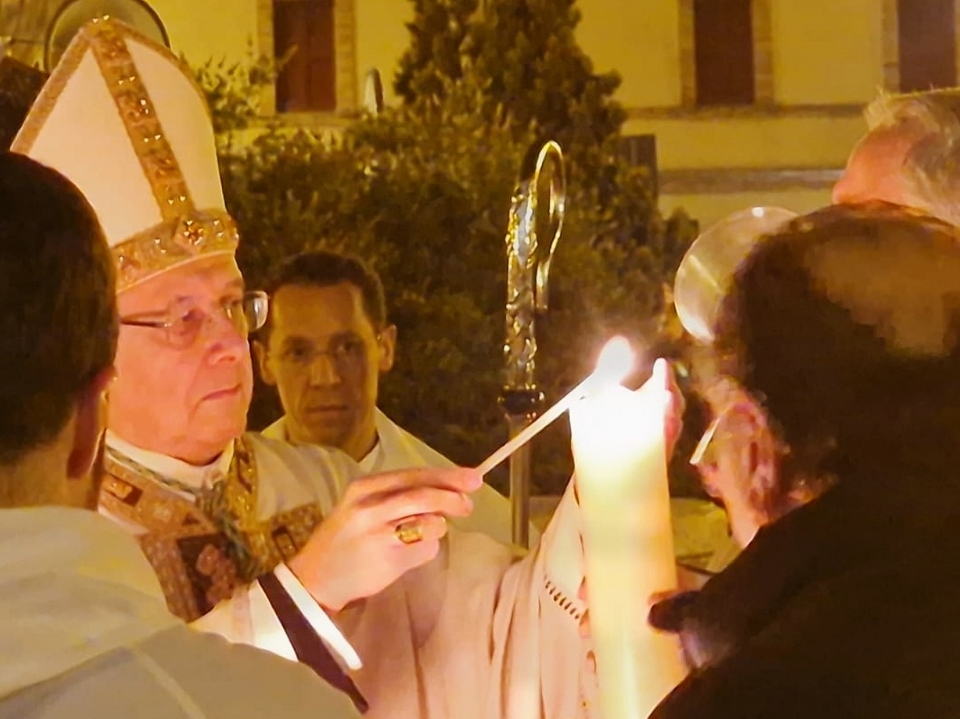 Nella piazza il Vescovo Carlo ha benedetto il fuoco e ha acceso il cero pasquale. Entrati in chiesa, i fedeli, partendo dal vescovo, hanno acceso le candele cantando per tre volte “Luce di Cristo, rendiamo grazie a Dio”. Una volta accese tutte le luci della chiesa, il diacono Walter Gandolfi ha proclamato l’Exultet, antichissimo inno scritto da Sant’Agostino.